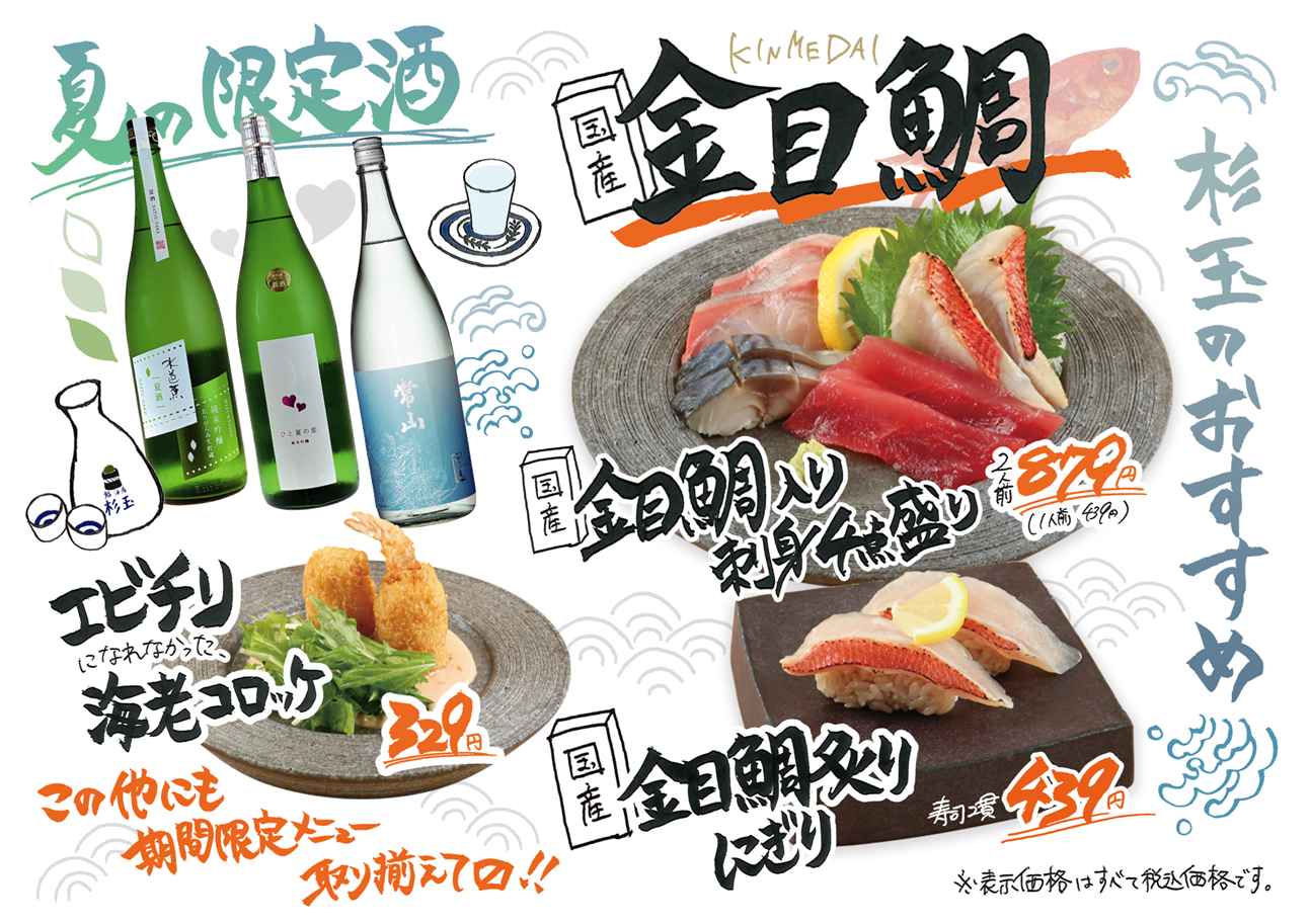 株式会社FOOD & LIFE COMPANIES(本社:大阪府吹田市、代表取締役社長 CEO:水留 浩一)の子会社である株式会社FOOD & LIFE INNOVATIONS(本社:東京都千代田区、代表取締役社長:木下 嘉人)は「鮨 酒 肴 杉玉」において、7月1日(金)より、高級魚である金目鯛や、遊び心溢れるネーミングの「エビチリになれなかった海老コロッケ」を期間限定で販売いたします。さらに、今だけしか味わえない、季節限定で出荷される、ひんやり美味しい地酒も期間限定で登場します。