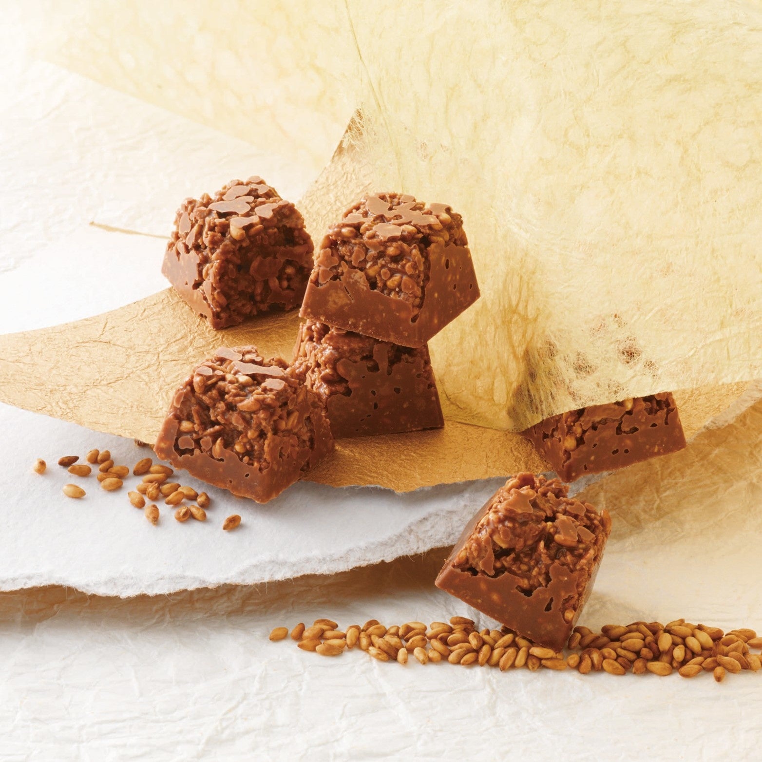 京都で丁寧に焙煎された炒り金ごまを、サクサクのフィアンティーヌ・砕いたアーモンドとあわせ、一口サイズのチョコレートにしました。金ごまは、職人がごまの香りが一番良くなる瞬間を逃さないよう丁寧に焙煎した香り豊かな炒りごまです。チョコレートは炒り金ごまの香りを引き立たせるため、カカオ感との味わいのバランスにこだわってブレンドしました。口に入れた瞬間から広がる炒り金ごまの香りとチョコレートとの組み合わせをお楽しみください。