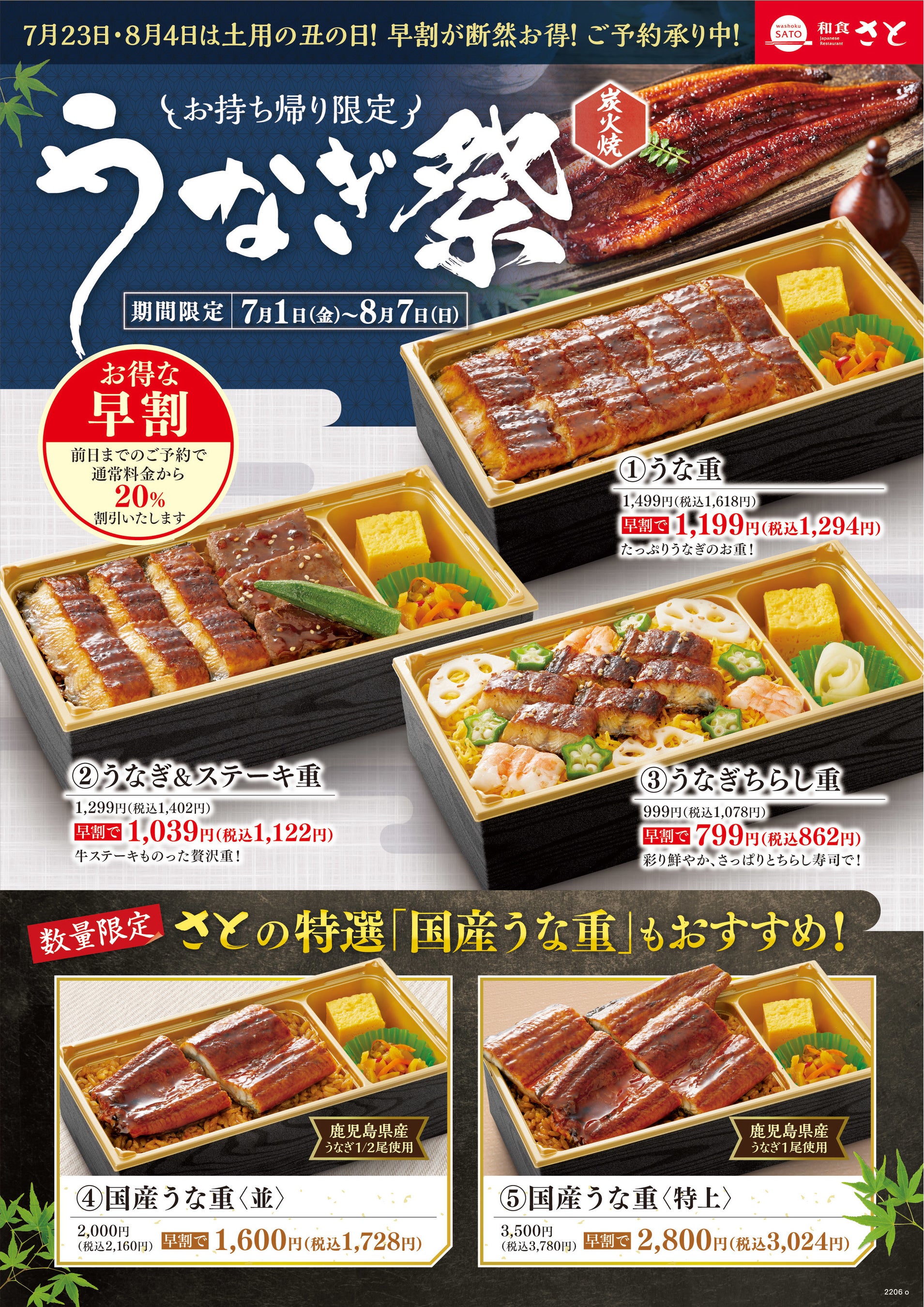 「和食さと」では、旬の食材【鰻(うなぎ)】を使用したテイクアウトキャンペーン「うなぎ祭」を、7月1日(金)から8月7日(日)までの期間限定で開催します。