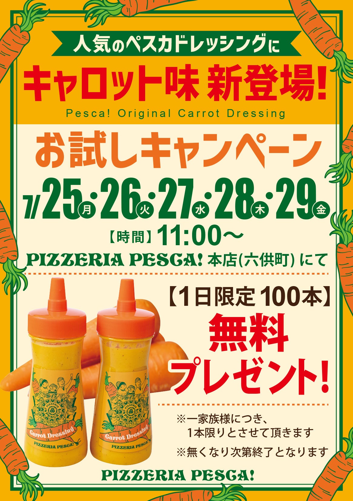 完全無添加・安心安全なオリジナルドレッシングで話題のイタリアンレストラン“PIZZERIA PESCA!”(群馬県前橋市六供町/代表 宮﨑雄一)は、この度、新フレーバーとして「キャロット味」を販売いたします。販売開始にあたり、PIZZERIA PESCA!本店にて、7/25(月)〜7/29(金)の5日間、1日100本限定で、無料お試しキャンペーンを実施します。