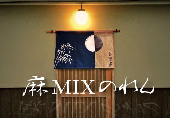 のれんは通常1種類の生地で製作をしますが、麻MIXのれんは割れの1つに麻生地を使い2種類の生地で製作します。デザインとして1割れだけ色を変えたり、柄を付けたりすることはありますが、生地そのものを変えているので、デザインだけでは出せない風合いを表現することが出来ます。生地をデザインの要素として使用することで、デザインに奥行きを出すことが出来ます。また、一部分だけに麻生地が使われているのれんは見た目も珍しく、誘目性も高まり、広告塔として認知度を高めてくれます。