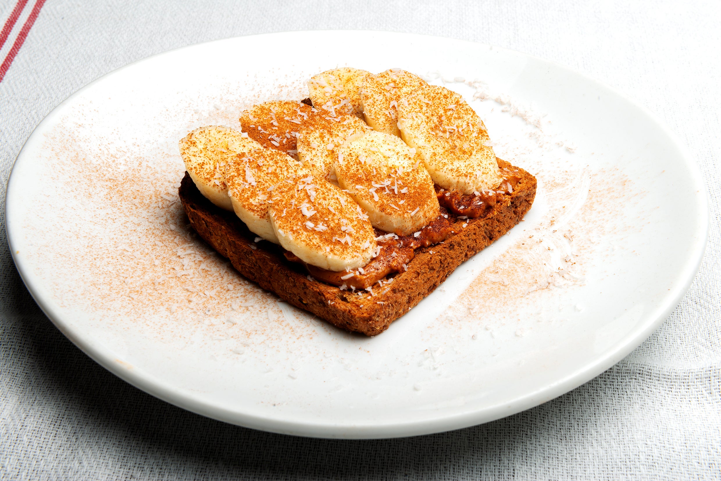 アリサンのシグネイチャー商品「有機ピーナッツバタークランチ」のコクと風味豊かなとバナナをトッピングした朝食にぴったりなオープントースト。