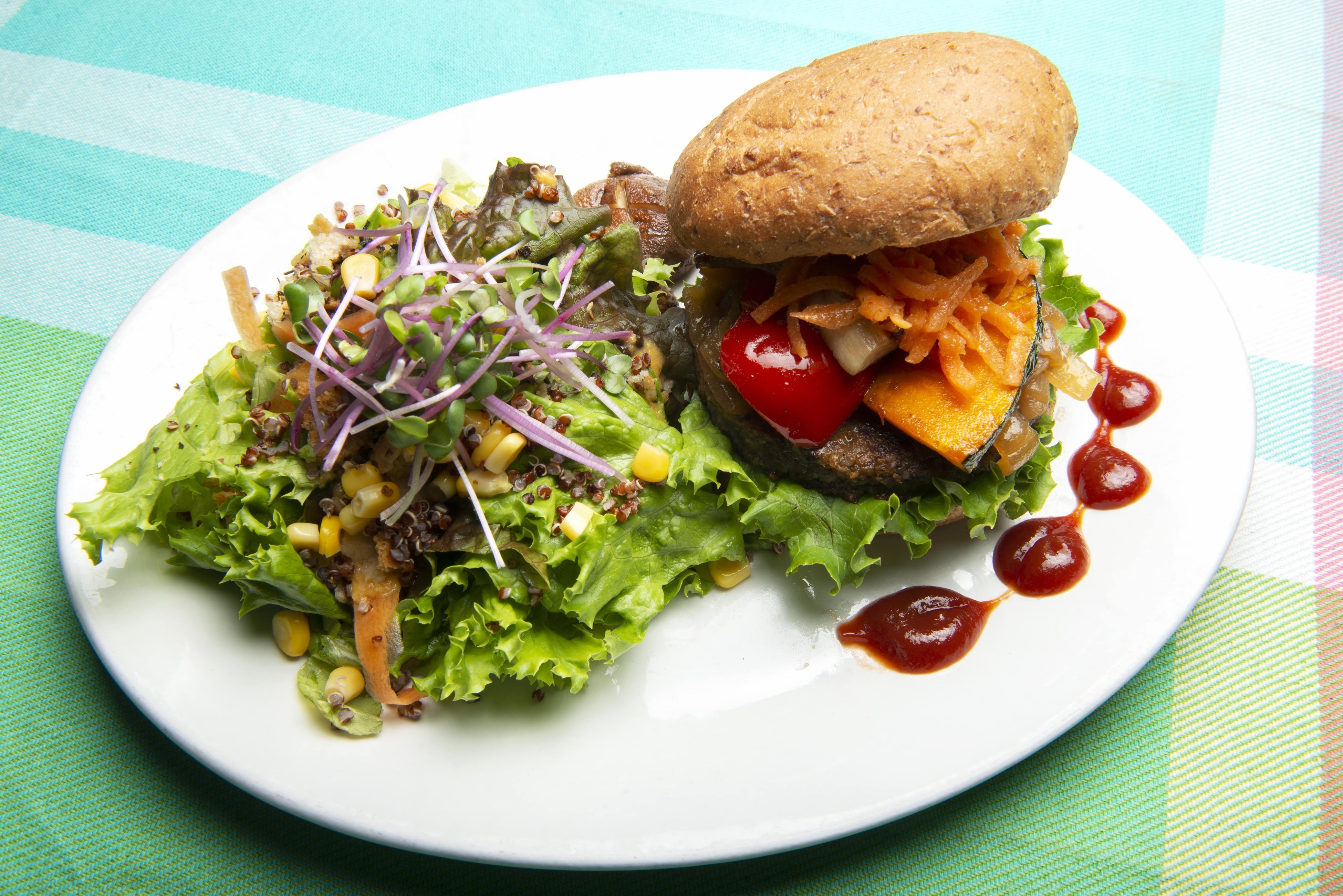 アリサンカフェの人気ナンバーワン&定番ベジバーガー。挽き割り小麦のザクザクした食感が特徴のパテ、季節の野菜と一緒にどうぞ。