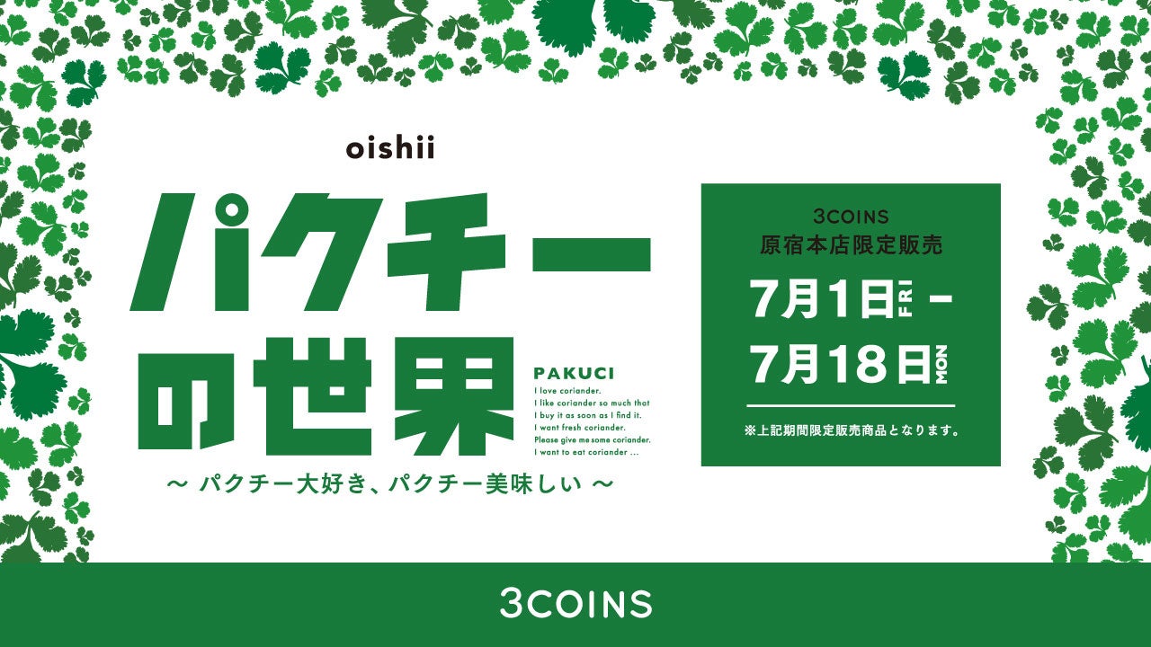 この度、より多くの方にパクチーの美味しく楽しい世界を知っていただきたいとの思いから、3COINS原宿本店にてポップアップショップ「パクチーの世界」を開催することを決定しました。美味しく、奥深い「パクチーの世界」をお楽しみください!