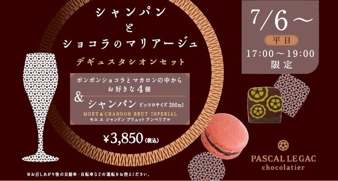 7月6日(金)~平日のみ17時から19時で、シャンパンとショコラのマリアージュセットを販売開始いたします。パスカル・ル・ガックの代表的なボンボンショコラとマカロンの中から、お好きなもの4個お選びいただき、シャンパンとのマリアージュをお楽しみください。