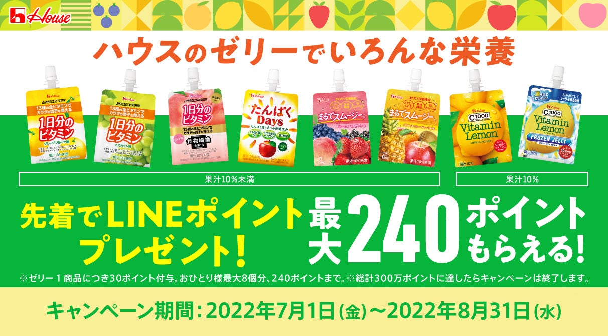 ハウスウェルネスフーズは、『ハウスのゼリーでいろんな栄養キャンペーン』を7月1日から8月31日の期間で開催します。「PERFECT VITAMIN 1日分のビタミンゼリー」シリーズを始めとする対象製品の購入レシートで応募ができ、先着で「LINEポイント」が最大240ポイントもらえるキャンペーンです。