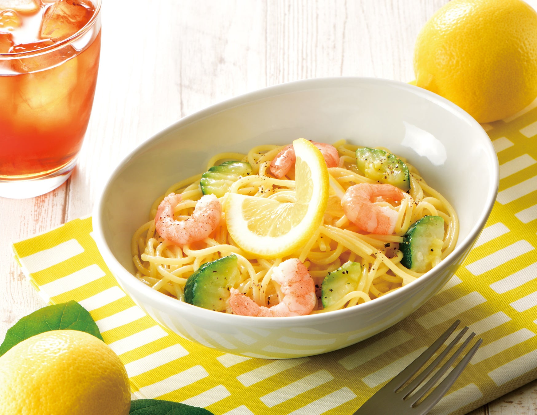 フードメニュー「パスタ 海老とズッキーニのレモンオイルソース」は、レモン果汁の爽やかな酸味とレモン果皮の程よい苦みを加えたレモンオイルソースに、ぷりぷり食感の海老とズッキーニをあわせたパスタです。暑い時期でも最後までさっぱりとお召し上がりいただけます。