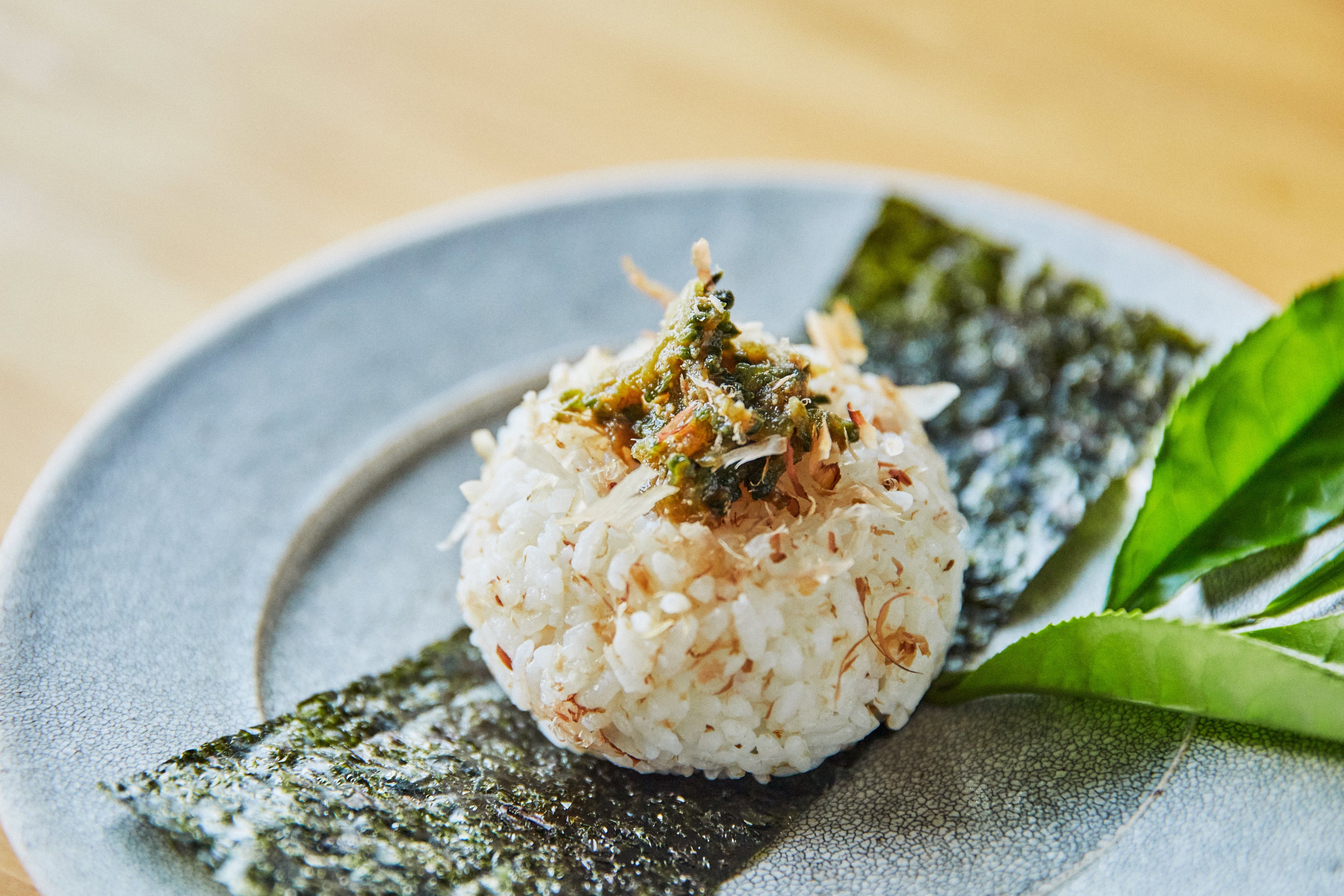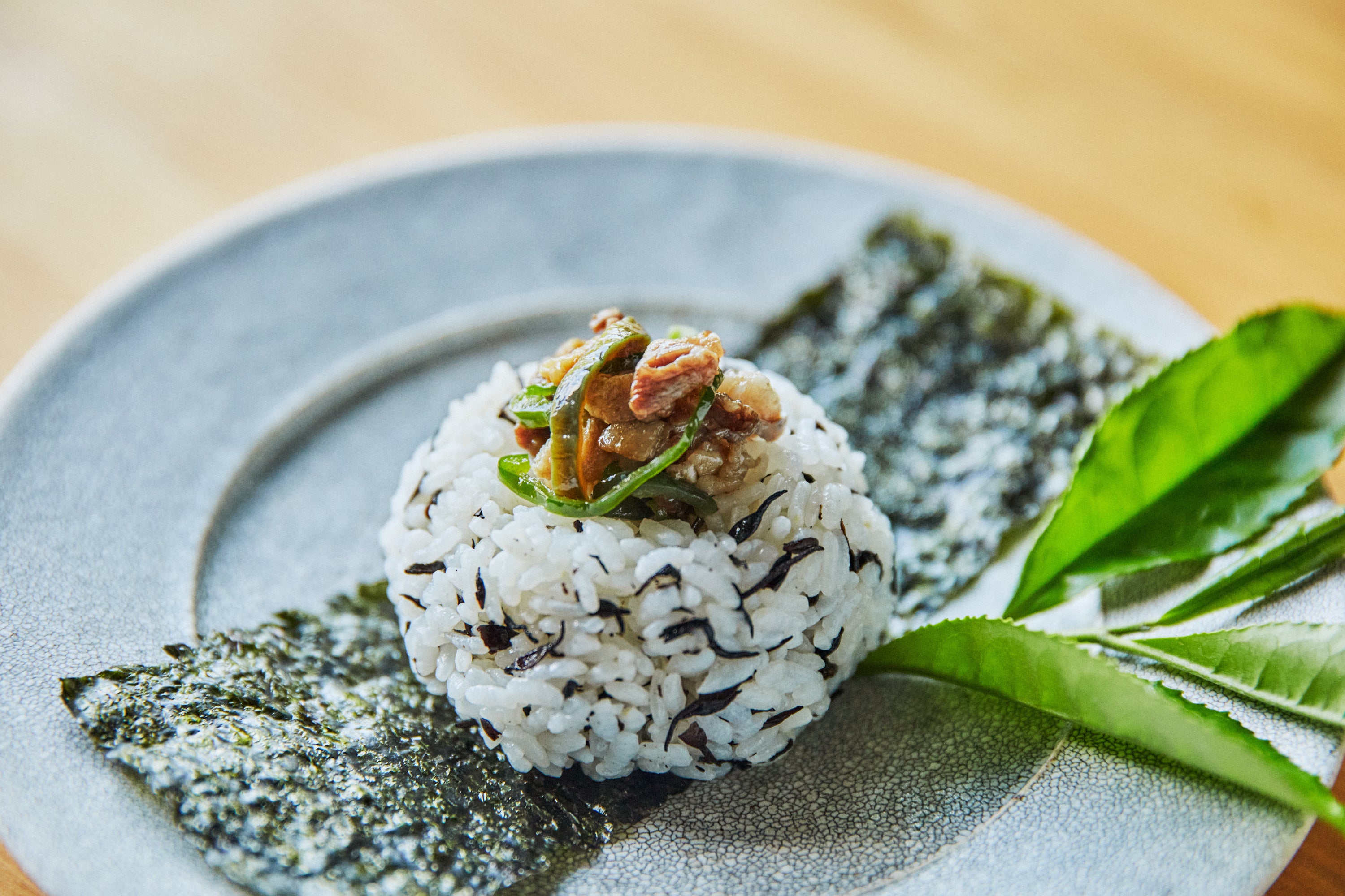 大子町の特産品である奥久慈の天然鮎や軍鶏を中心に、地産の夏野菜やお米そのもののおいしさを掛け合わせた、6種類の味から選べる“贅沢おむすびプレート”を開発しました。おなじく地産の豆乳で仕立てた“冷や汁”や、地域で愛されてきた“のし梅”をアレンジしたスイーツとともにご賞味ください。