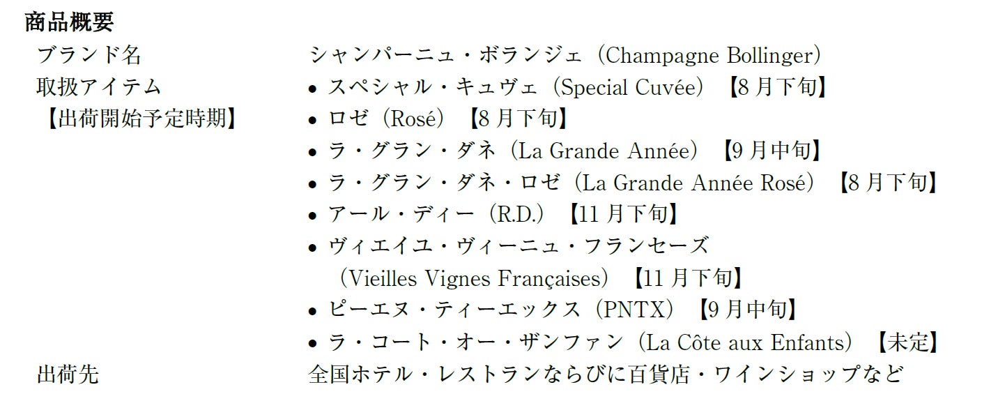 今回の締結を通して、シャンパーニュ・ボランジェの意向である日本のマーケットにおけるさらなる存在感や認知度の拡大に取り組みます。また、当社のシャンパーニュ・ラインナップを拡充することで、「新しい体験価値の提案」を加速させ、ワインのある豊かな食生活に対してさらに貢献していきます。
