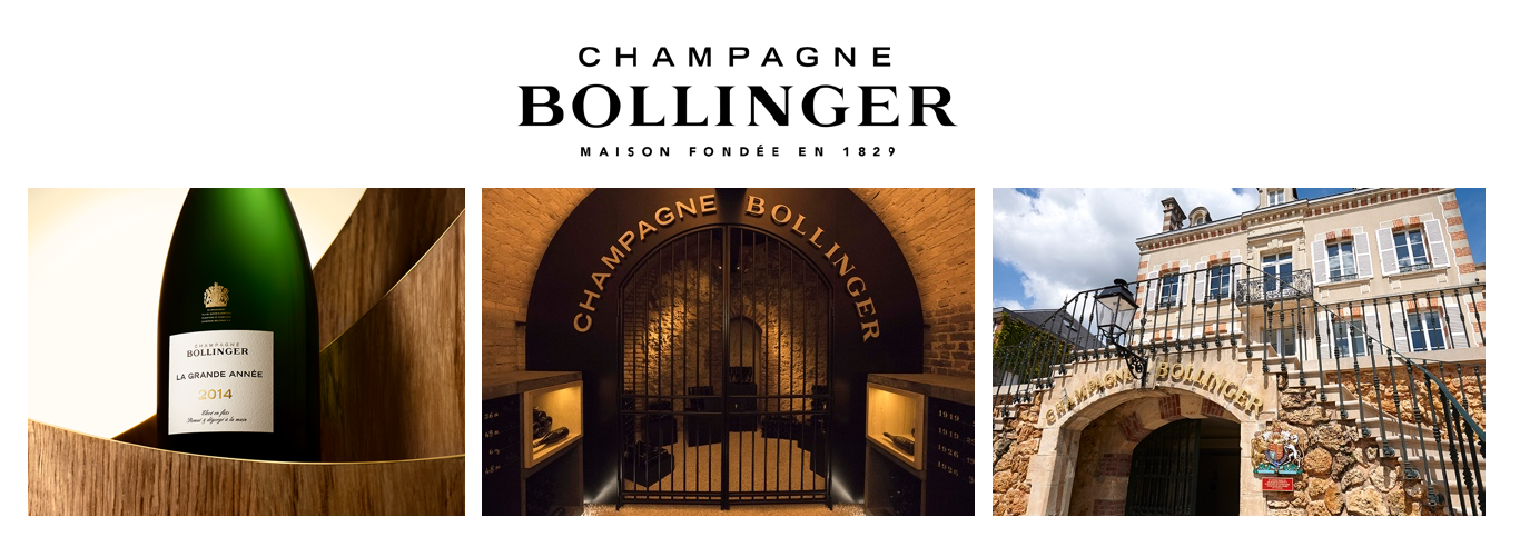 「シャンパーニュ・ボランジェ(Champagne Bollinger)」は1829年にジャック・ボランジェ氏によってシャンパーニュ地方のアイ村に創設された、今なお家族経営の老舗メゾンです。エリザベス・“リリー”・ボランジェ女史の時代より構築された、178ヘクタールの畑の80%以上がグラン・クリュおよびプルミエ・クリュで構成され、上質なピノ・ノワールの香りとエレガンスを活かした、独自のスタイルを確立しています。1992年には、倫理的および品質的基準を遵守した製造を維持する目的で「ボランジェ憲章」を発表し、この公約に基づき生産される卓越したシャンパーニュは世界的な名声を獲得しています。1884年から英国王室御用達を拝命し、名作映画「007」シリーズでも度々登場するなど、世界的に知名度の高いブランドです。