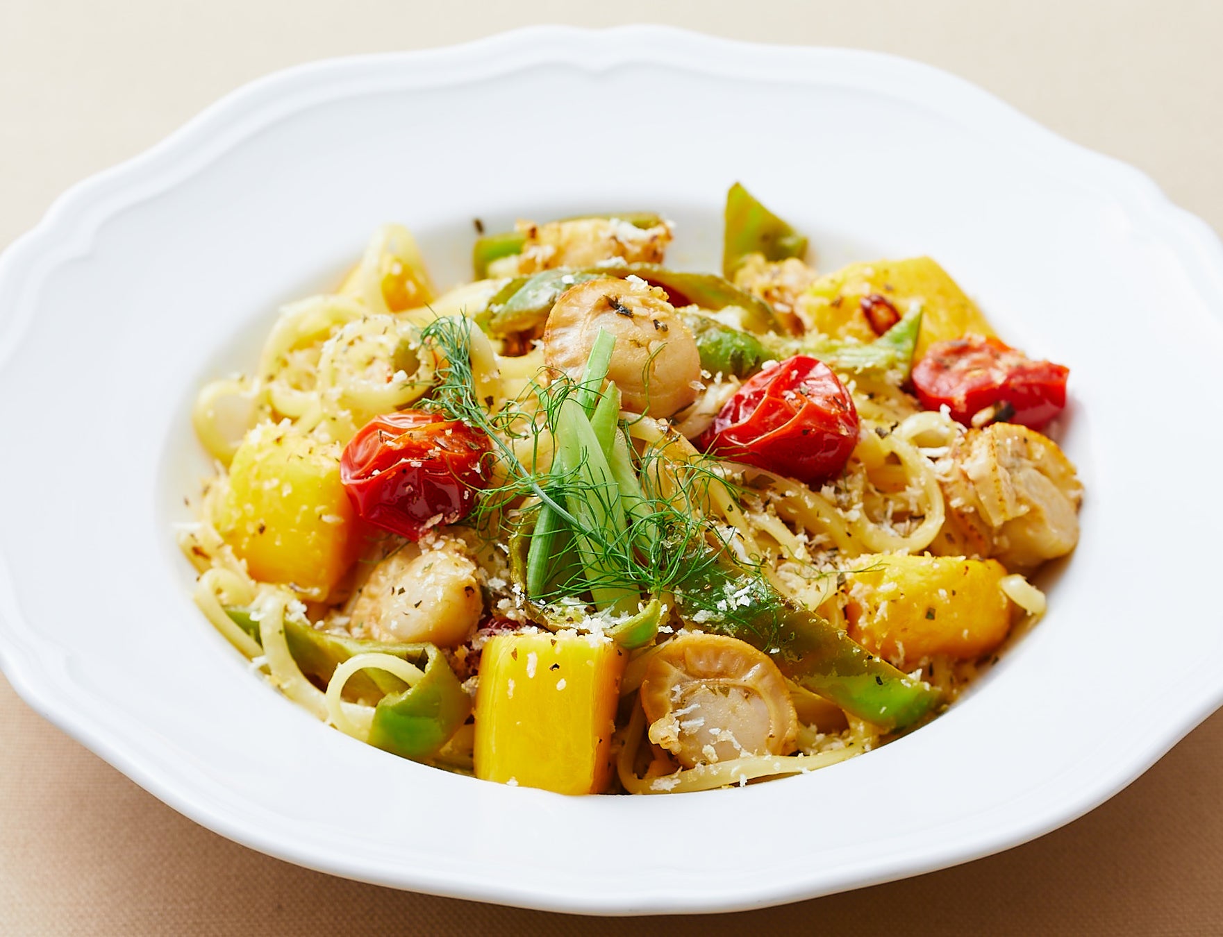 1. ベビーホタテと万願寺とうがらしのマンゴーペペロンチーノ/¥1,980円(税込)