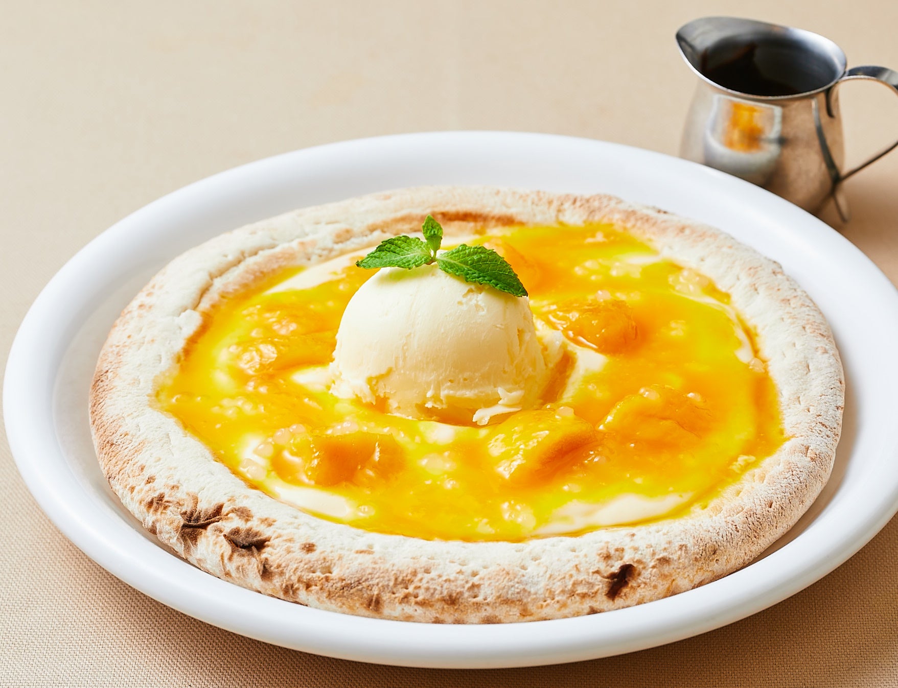 酸味のある爽やかなレモンカスタードクリームとマンゴーソースを組み合わせたデザートピザです。