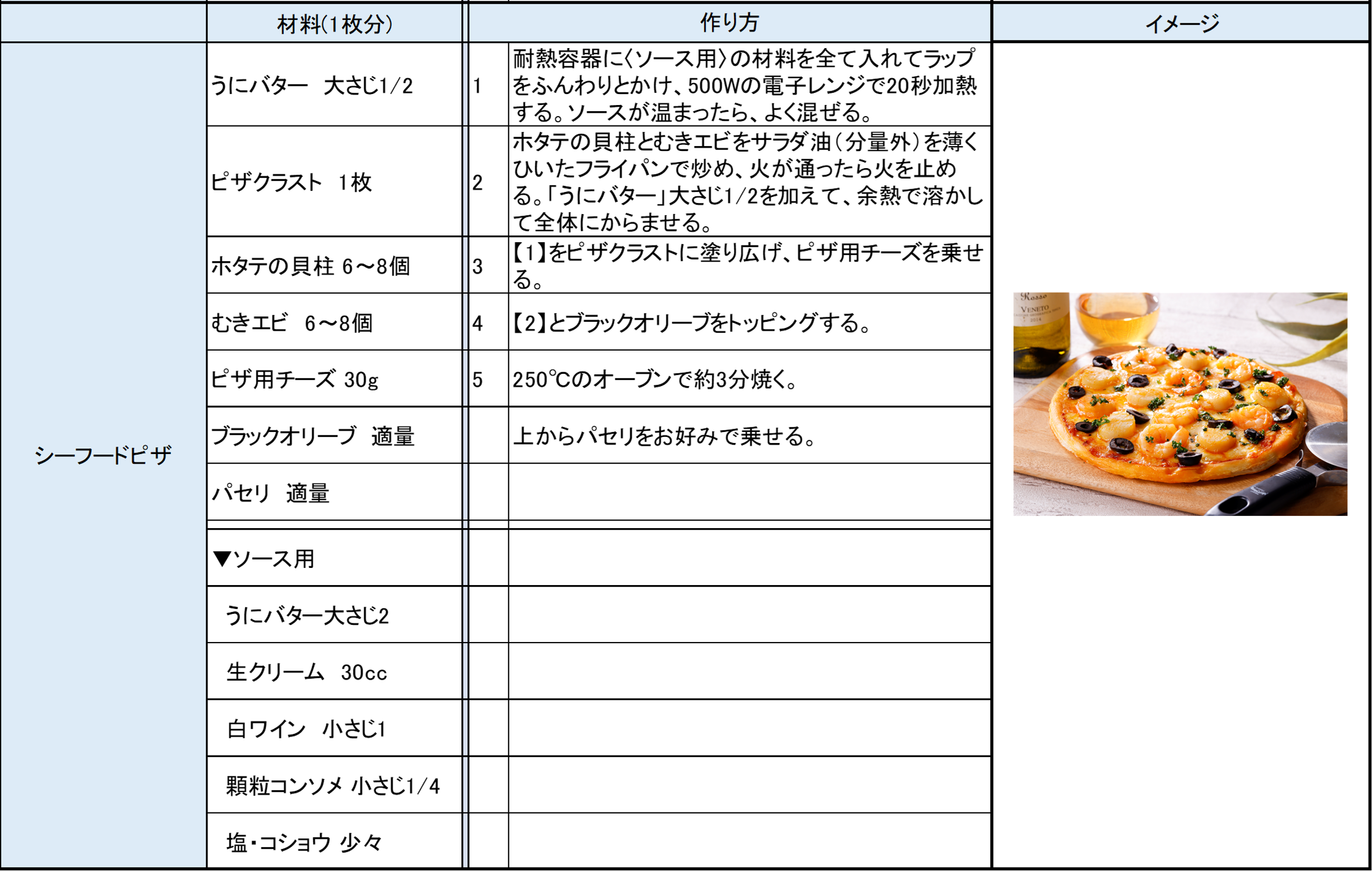 原材料:食用植物油脂(国内製造)、食用精製加工油脂、うに調味料粉末(デキストリン、うにエキス、混合うに、食用パーム油、たんぱく加水分解物、酵母エキス)、バター、混合うに、食塩、砂糖混合ぶどう糖果糖液糖、ホタテエキスパウダー、カツオエキス/調味料(アミノ酸等)、乳化剤、pH調整剤、着色料(パプリカ色素、カロテン)、香料、(一部に乳成分・大豆を含む)