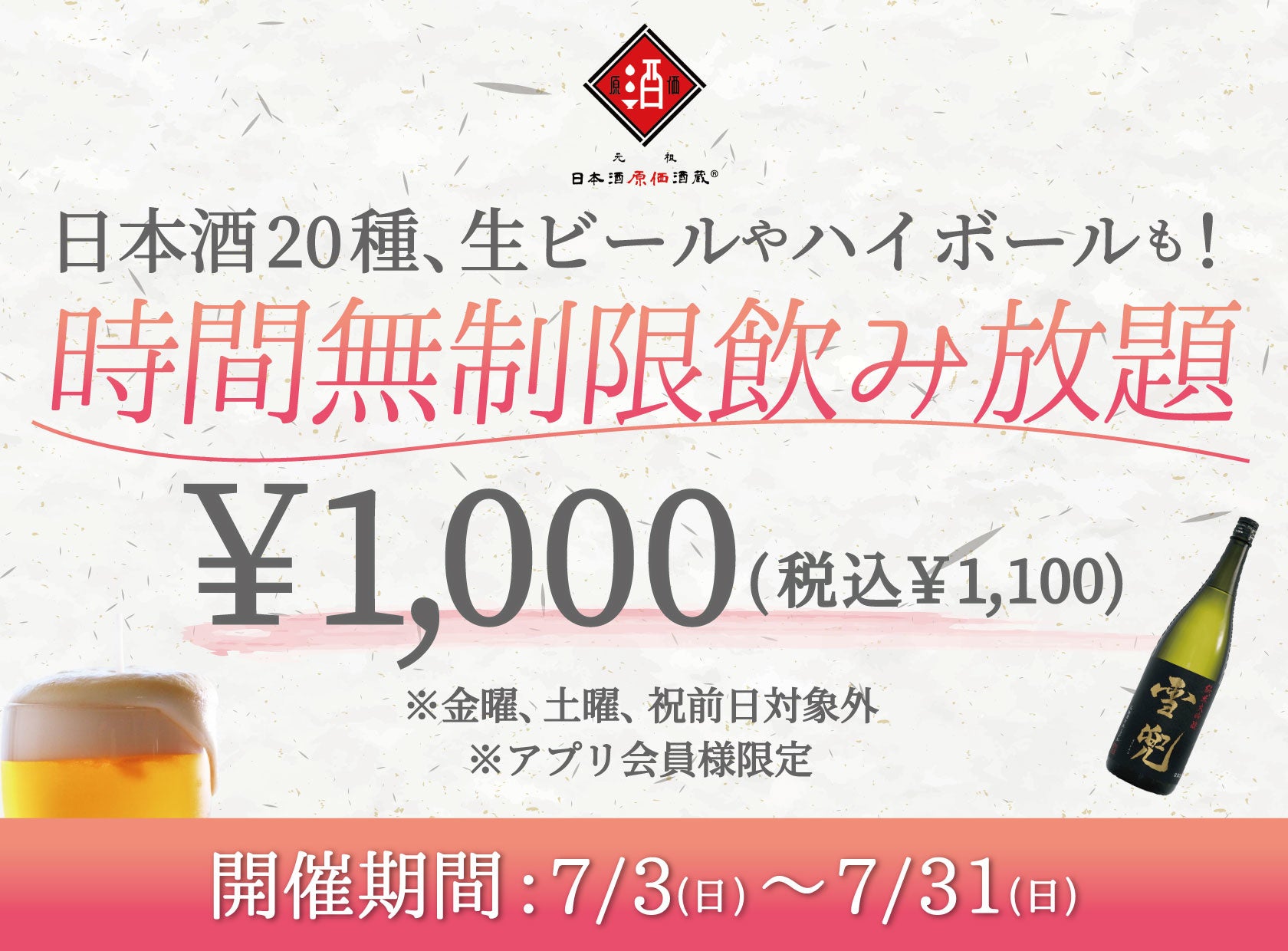 株式会社クリエイティブプレイス(本社:東京都品川区 代表:中村雄斗)が運営する日本酒原価酒蔵では、全店舗にて7月3日(日)~7月31日(日)の期間、時間無制限飲み放題¥1,000(税込¥1,100)~を開催します。※日曜~木曜日、1日30名様限定