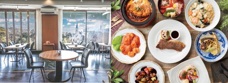 大きな窓から降りそそぐ光の中でイングリッシュガーデンと「天使の教会」が一望できる広々とした空間です。シェフが心を込めて作る和・洋・中のグローバル料理をご賞味ください。ディナータイムはロマンティックな雰囲気の中で、しっとりとした音楽を聴きながら落ち着いた雰囲気でお食事をお楽しみいただけます。