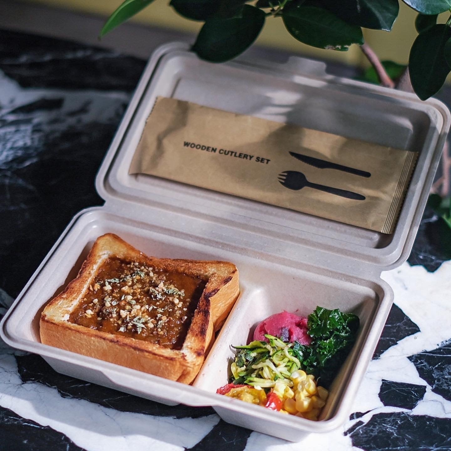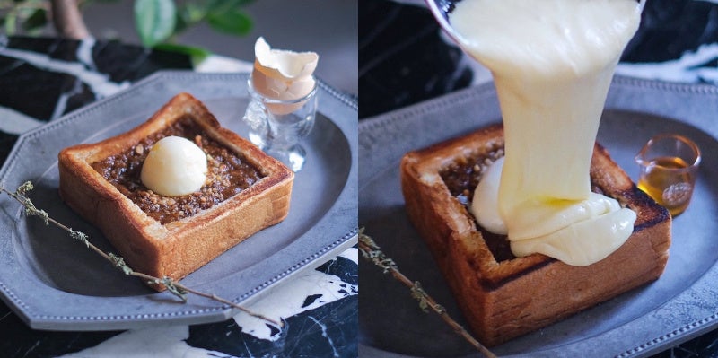高級食パン専門店「考えた人すごいわ」製の食パンを5㎝厚にカットして食べられる器に仕立て、202カリー堂のスープカリーを注ぎ入れて提供いたします。食感のポイントにミックスナッツを振りかけています。添えるシチリア産のオレガノの枝から葉っぱを潰しながらたっぷりかけたらまずはそのまま、白の温泉卵をお好みのタイミングで割り入れてまろやかさもお楽しみいただきます。