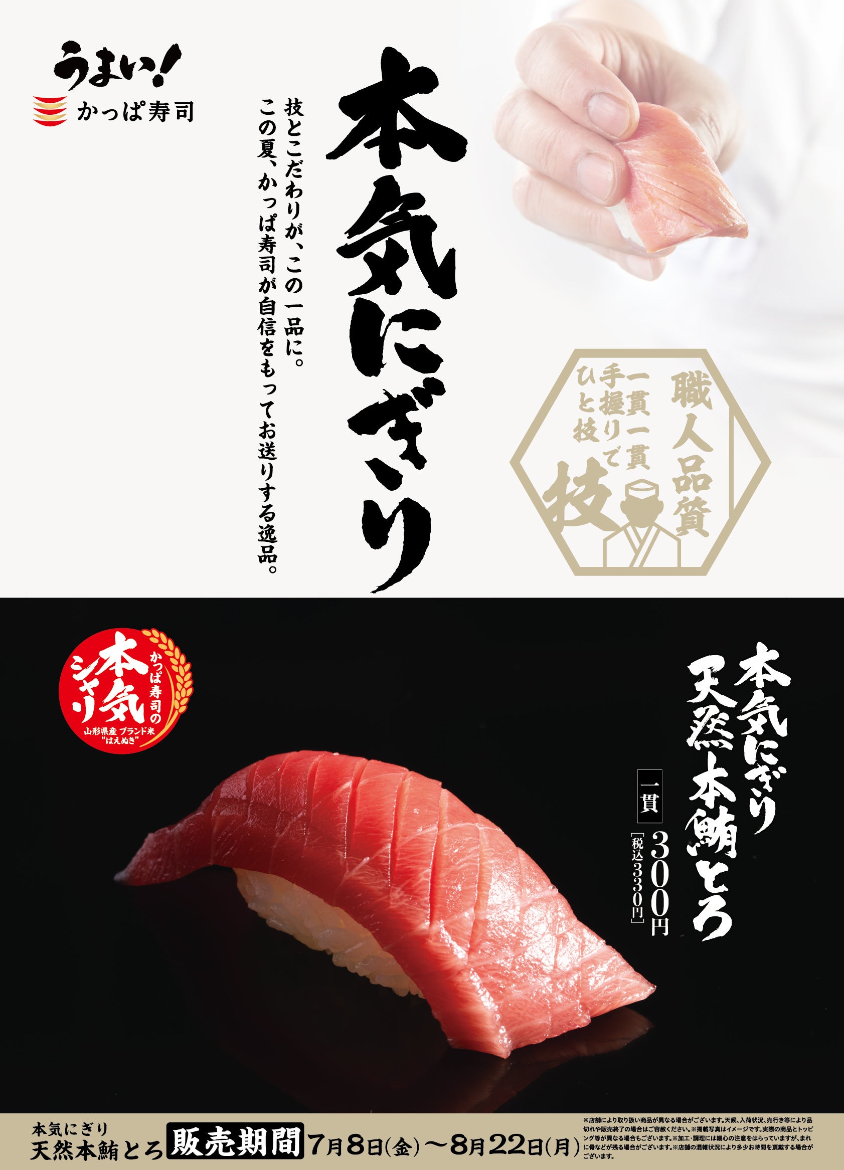 ‟回転寿司屋から寿司屋品質へ”をスローガンに掲げ、シャリを山形県産ブランド米「はえぬき」単一使用へ変更する等、大きな改革を実施した昨年2021年の夏に登場した『本気にぎり』。本商品は寿司屋品質の“うまい!”を本気で実現したかっぱ寿司の挑戦が詰まった一貫です。