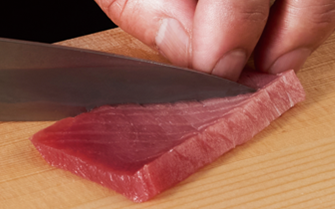 『本気にぎり 天然本鮪とろ』には“飾り包丁”を施しております。このひと仕事を加えることで、寿司はよりいっそう華やかに、そして美しく仕上がります。飾り包丁を一本一本入れることで、醤油は「とろ」の脂にはじかれず、シャリとネタはより調和し、口の中で心地よくほぐれていきます。