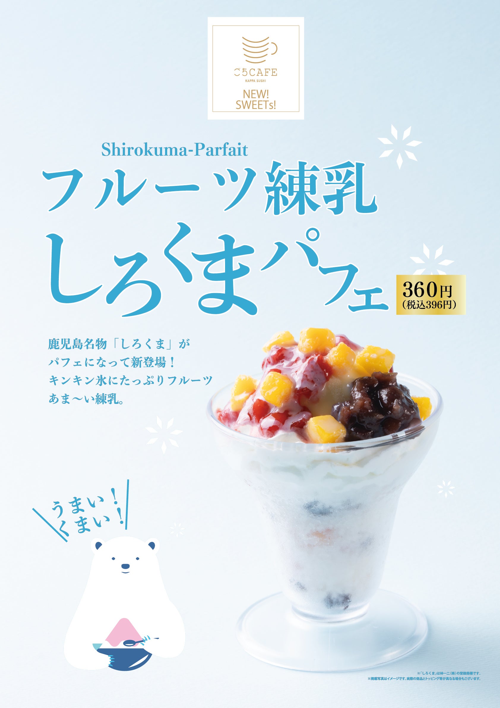 かっぱ寿司の夏スイーツに、九州発、練乳の旨みたっぷりの「しろくま」が登場です! 2年以上の交渉を重ねついに仕入れに成功した「練乳氷」が味の決め手!中には、いちごやパイナップルの果肉、そして小豆が入っています。トッピングにはバニラアイスとストロベリーソース、冷凍マンゴーフルーツをたっぷり添えました!仕上げにコンデンスミルクをかけて、かっぱ寿司の『フルーツ練乳 しろくまパフェ』が完成です。