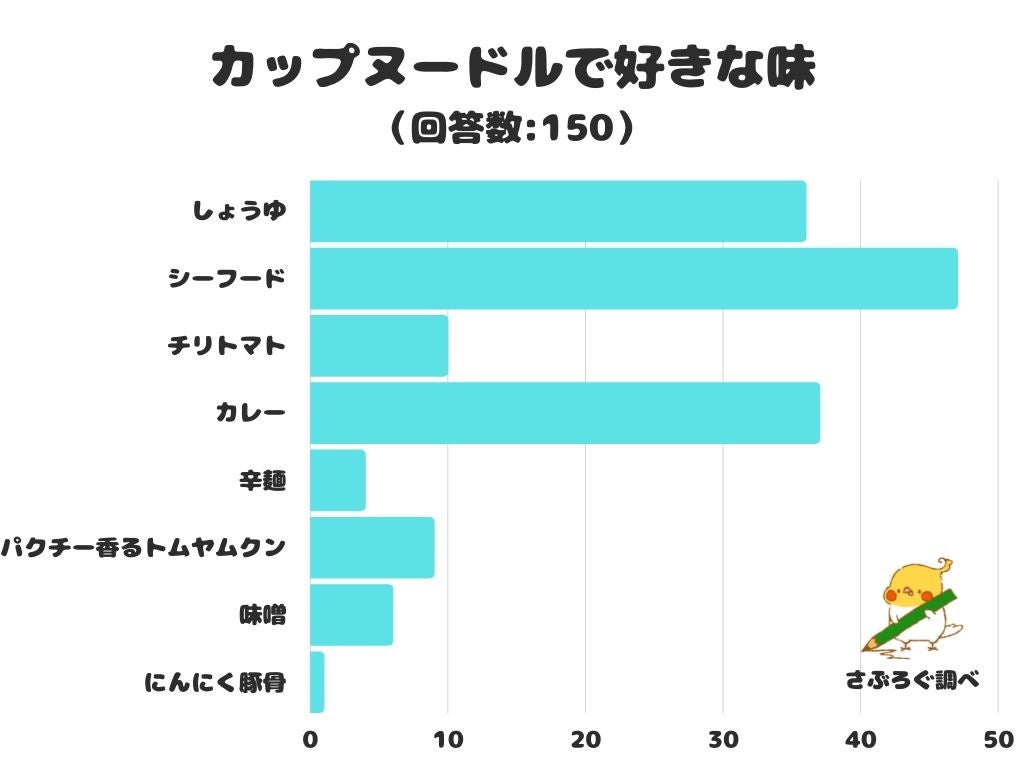 カップヌードルで好きな味をアンケートにて調査したところ、1位は「シーフード」でした。