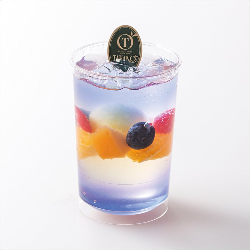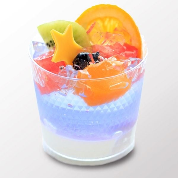 バタフライピージュレにシークァーサージュレを重ね、希少糖ジュレにフルーツを浮かべたジュレデザート。