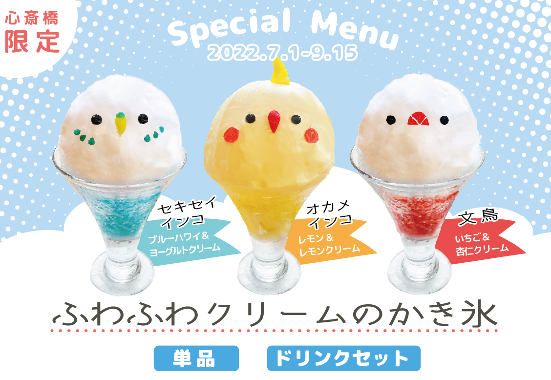 楽しく暮らしているインコたちを眺めながら、自慢のことりスイーツとお茶を楽しめる大阪 心斎橋の【ことりカフェ心斎橋】を運営する株式会社エクシードジャパン(大阪市淀川区西中島4-3-8 代表取締役 嘉 康一)は、店舗で期間限定のインスタ映えする「ふわふわクリームのかき氷」のご提供をスタートしました。