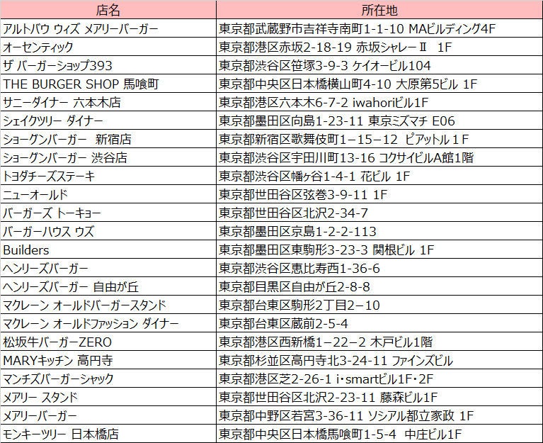 対象店:東京エリアのグルメバーガー取扱店 23店(詳細は以下リスト参照)※五十音順
