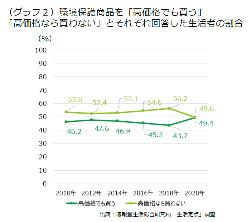 グラフ2は、博報堂のシンクタンクが実施した定点観測調査に対し、環境保護商品を「高価格でも買う」「高価格なら買わない」とそれぞれ回答した生活者の割合です。2020年に「高価格でも買う」の割合が2018年より約6ポイント増え49.4%となり、「高価格なら買わない」と拮抗しました。