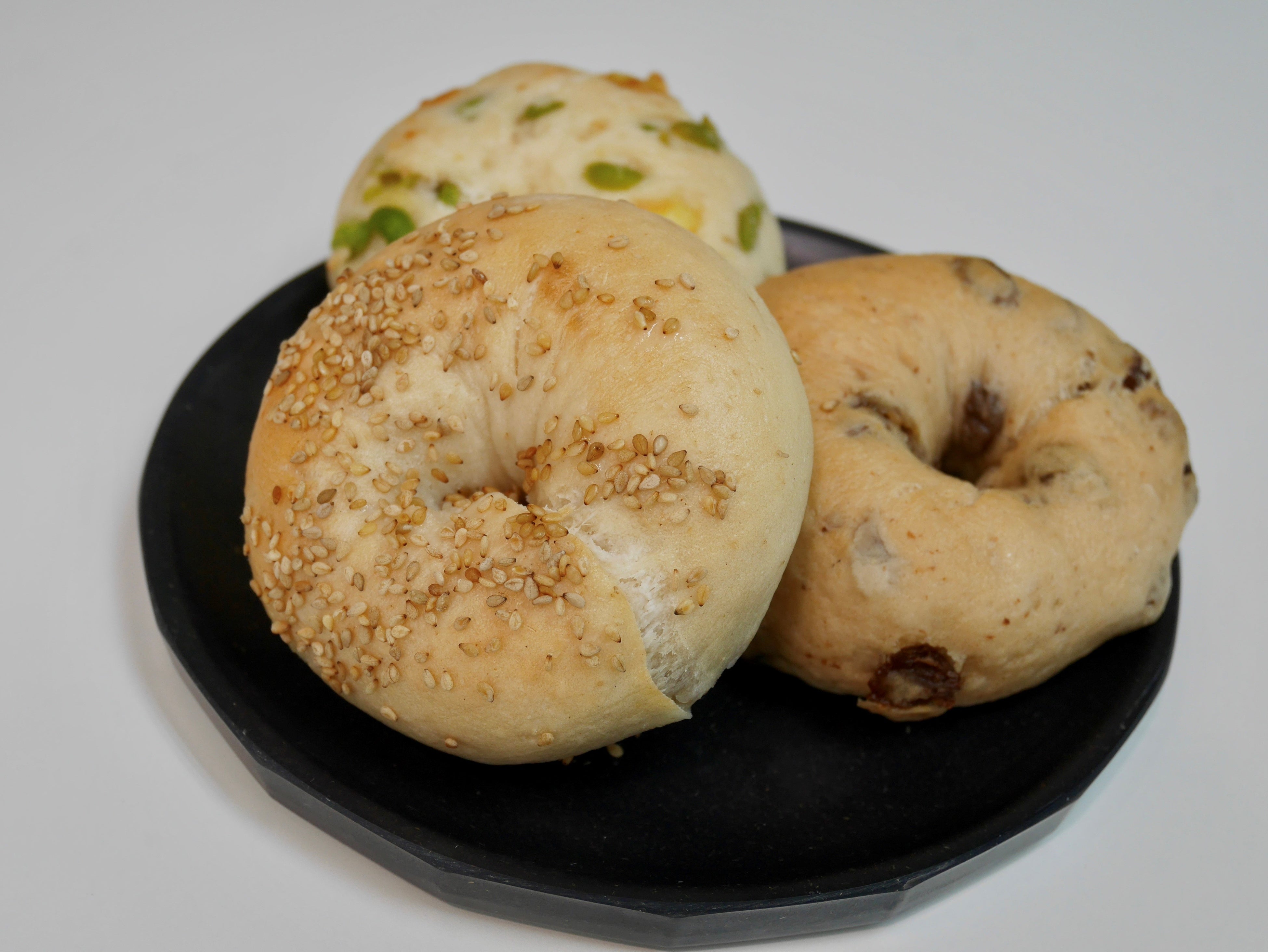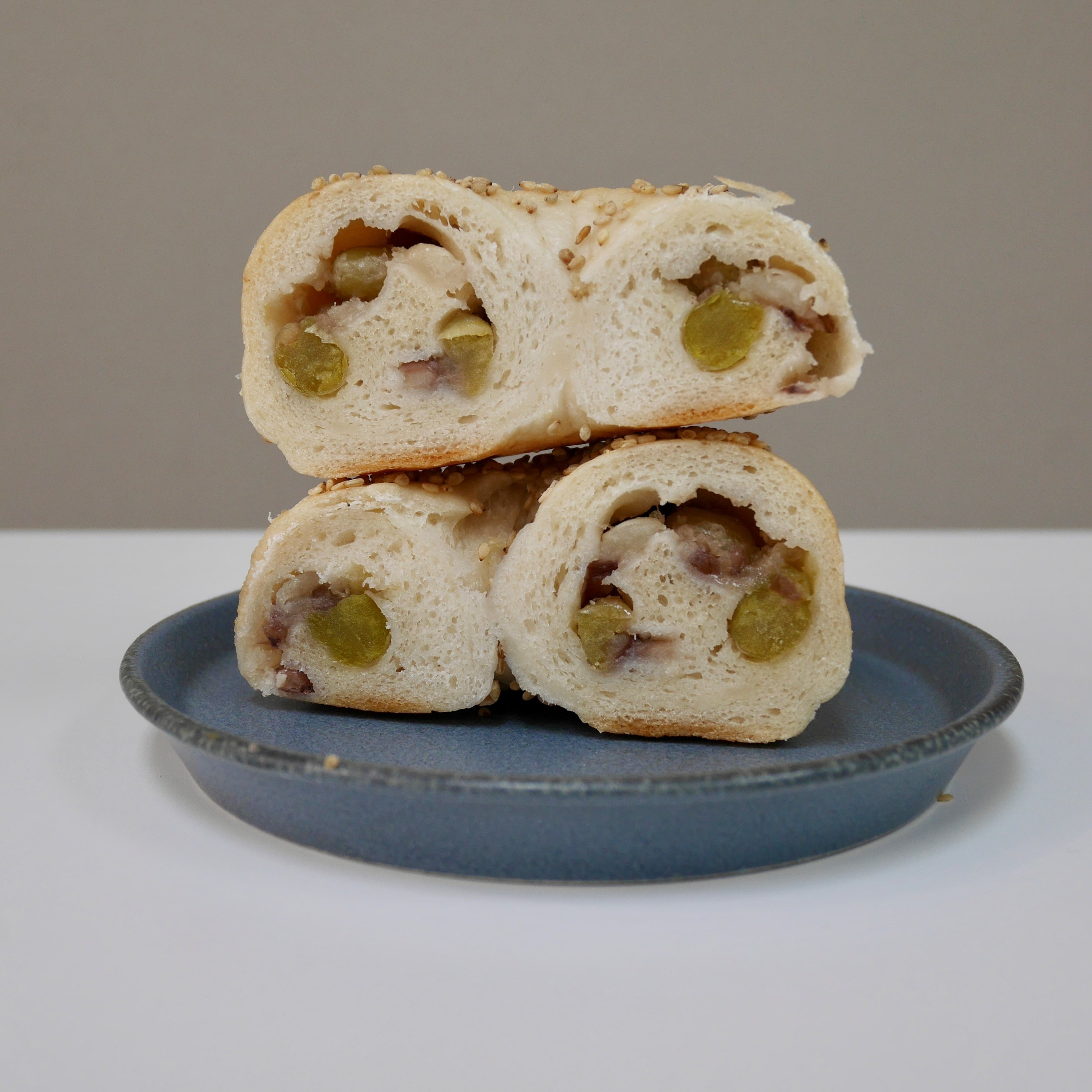 プレーンベーグル生地に小豆、白手亡(てぼう)豆、えんどう豆の3種のかのこ豆を包み、白ごまをふって焼き上げました。和菓子に使用されることの多いかのこ豆は米粉生地との相性が良く、からだに優しい和ベーグルです。