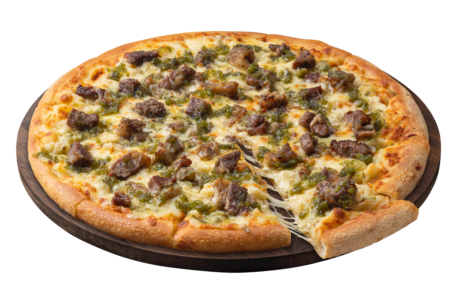 炭火香るジューシーなビーフと、シャキシャキした食感がアクセントの静岡県産本わさびのソースをトッピングしたピザです。富士山のふもとの清流で育てられた本わさびは辛さの中にも爽やかさが感じられます。チーズとビーフというパンチのある食材の組み合わせに、本わさびをソースにして合わせ、サッパリとした夏らしい味わいにまとめました。