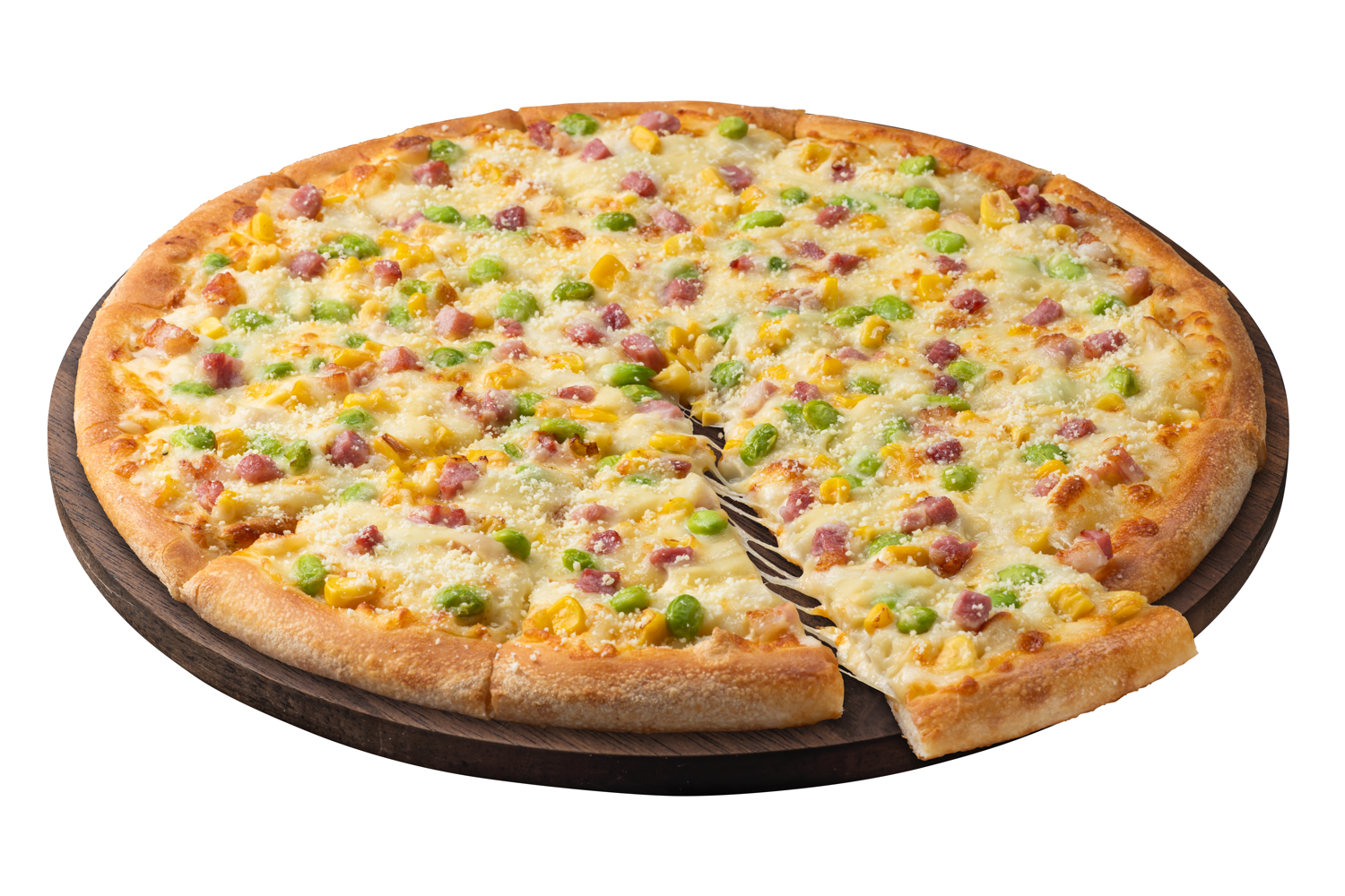 甘くてクリーミーな十勝産ピュアホワイトコーンと、野菜本来の甘みを楽しめる枝豆が相性バツグンなピザ。十勝の寒暖差によるメロンよりも高い糖度が特徴のホワイトコーン自体をソースにしたことで、食べた瞬間にコーンの甘みと味わいが口いっぱいに広がります。また、コーンと枝豆で夏らしい色味に仕立てました。