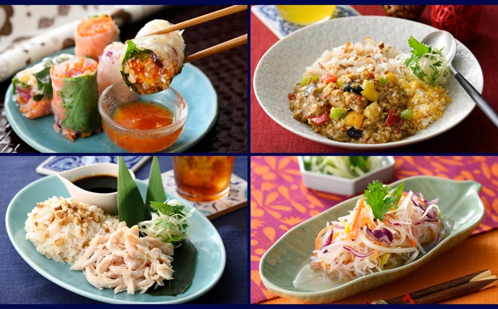 エスニックな香りと甘辛い鶏挽肉がたまらない!食欲をそそる『ガパオライス』とさっぽり蒸し鶏とともに味わう『カオマンガイ』。屋台で人気の麺料理、色鮮やかなデリやトッピングをご自身で巻いて楽しめる『生春巻き』などの定番メニューが勢ぞろい!