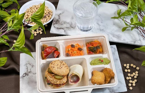 お肉のような食感と味わいの大豆ミートのミニバーガーと各種デリ。環境に配慮し紙製容器を使用し、体にも地球にもやさしいプランです。