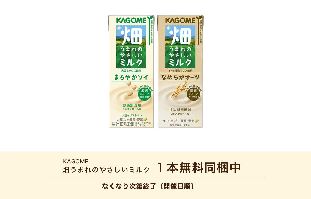 nonpi foodbox™サステナブルフードシリーズのプランをご注文のお客様限定で、カゴメの新商品「畑うまれのやさしいミルク」シリーズのいずれか一本をお付けします。