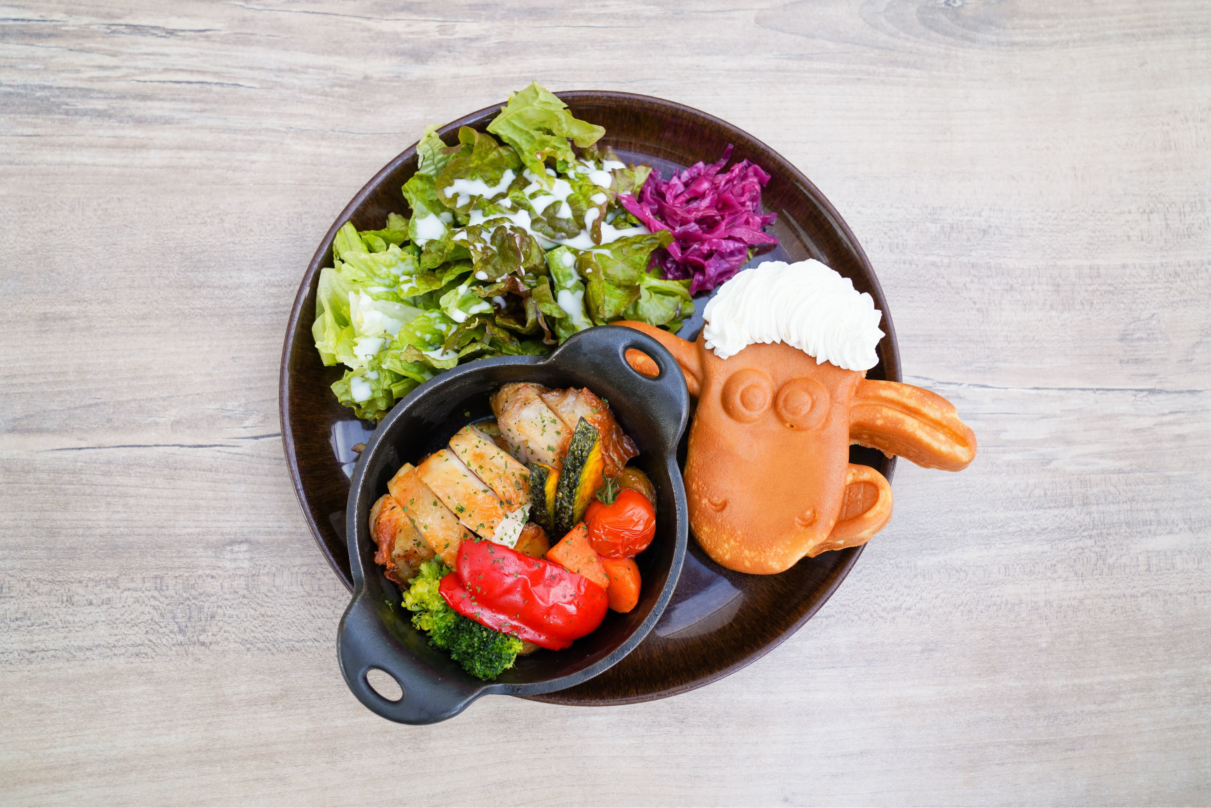 芝生の上にいるシャーリーのおなかには卵やお野菜などが隠されています。よく混ぜてサラダとしても、パンに挟んでサンドウィッチにしても楽しめます♪