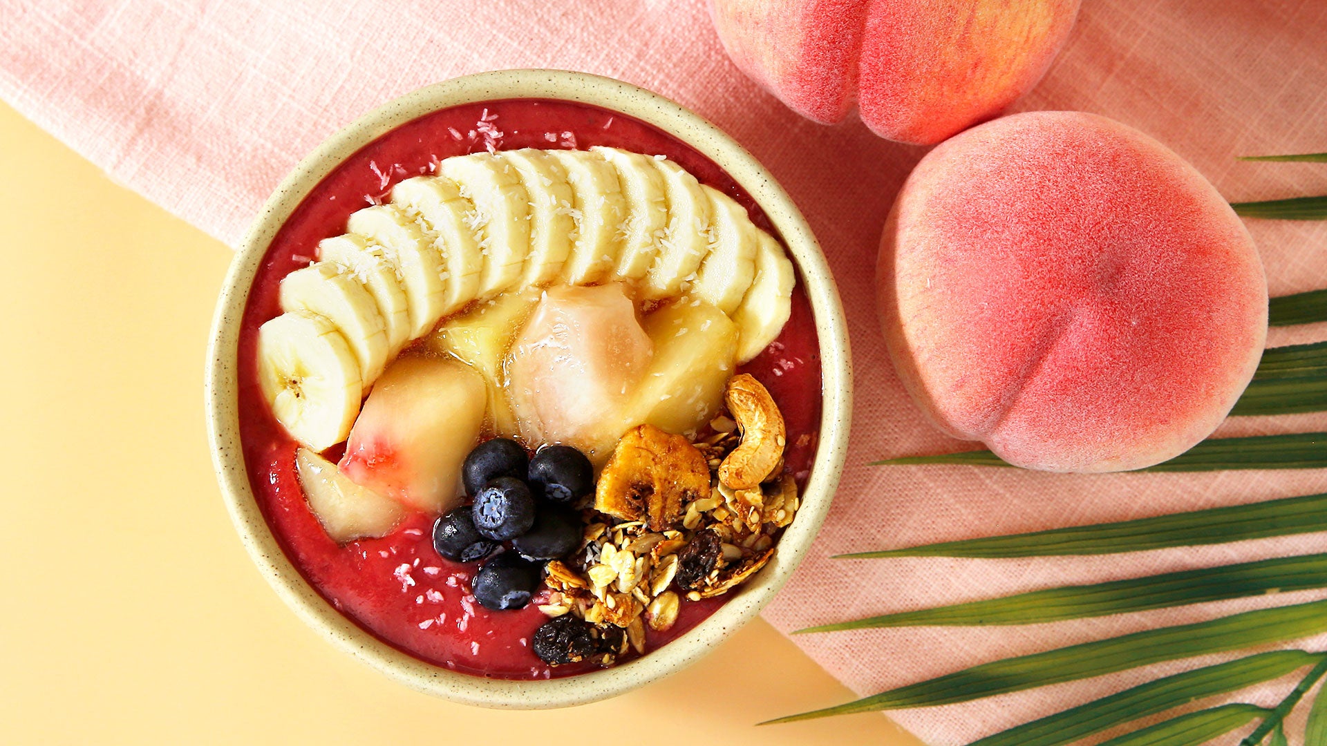 ビーツの天然の赤が際だつイチゴ味のスムージーボウルに、旬の白桃をトッピング!