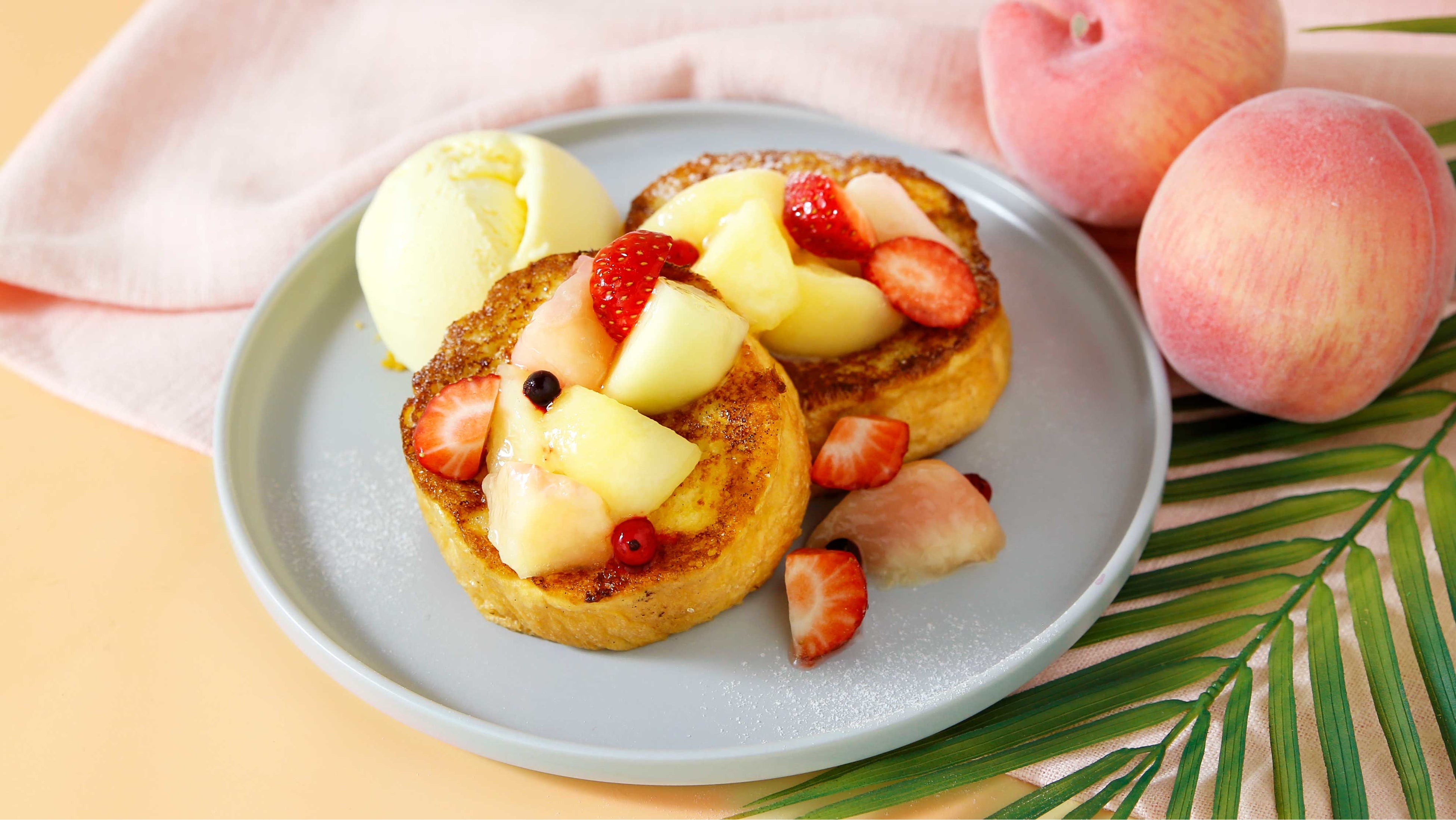 レギュラーメニューの中では常に人気上位のフレンチトーストに、優しい甘さの白桃&甘酸っぱいイチゴをON!