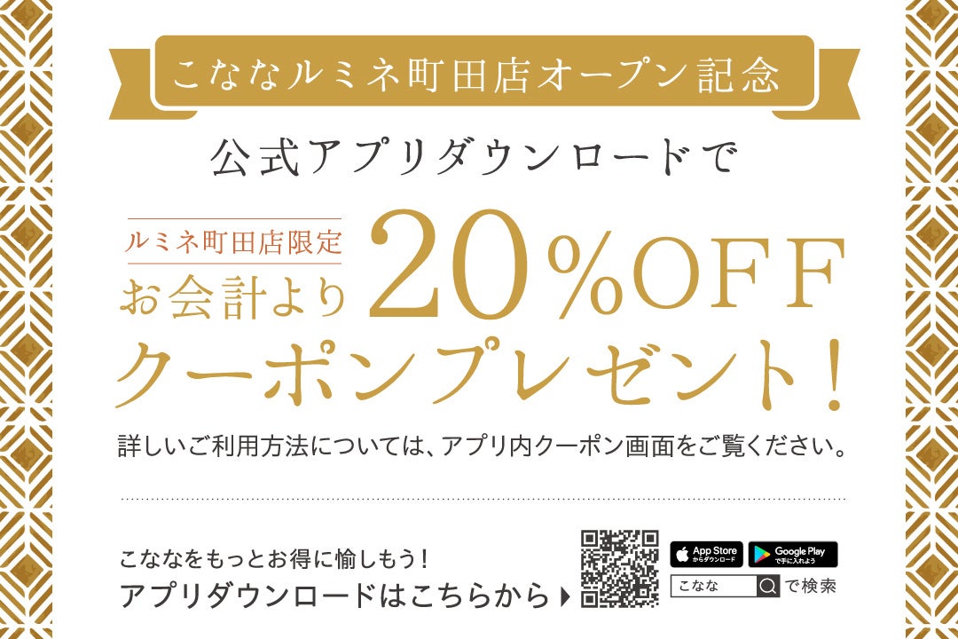 こななルミネ町田店のオープンを記念して、こなな公式アプリで20%OFFクーポンを配信中! 是非この機会にこなな公式アプリにご登録ください! ランチタイムに、ゆったりとカフェタイムに、仕事終わりのディナータイムに、お得にこななをお愉しみください。