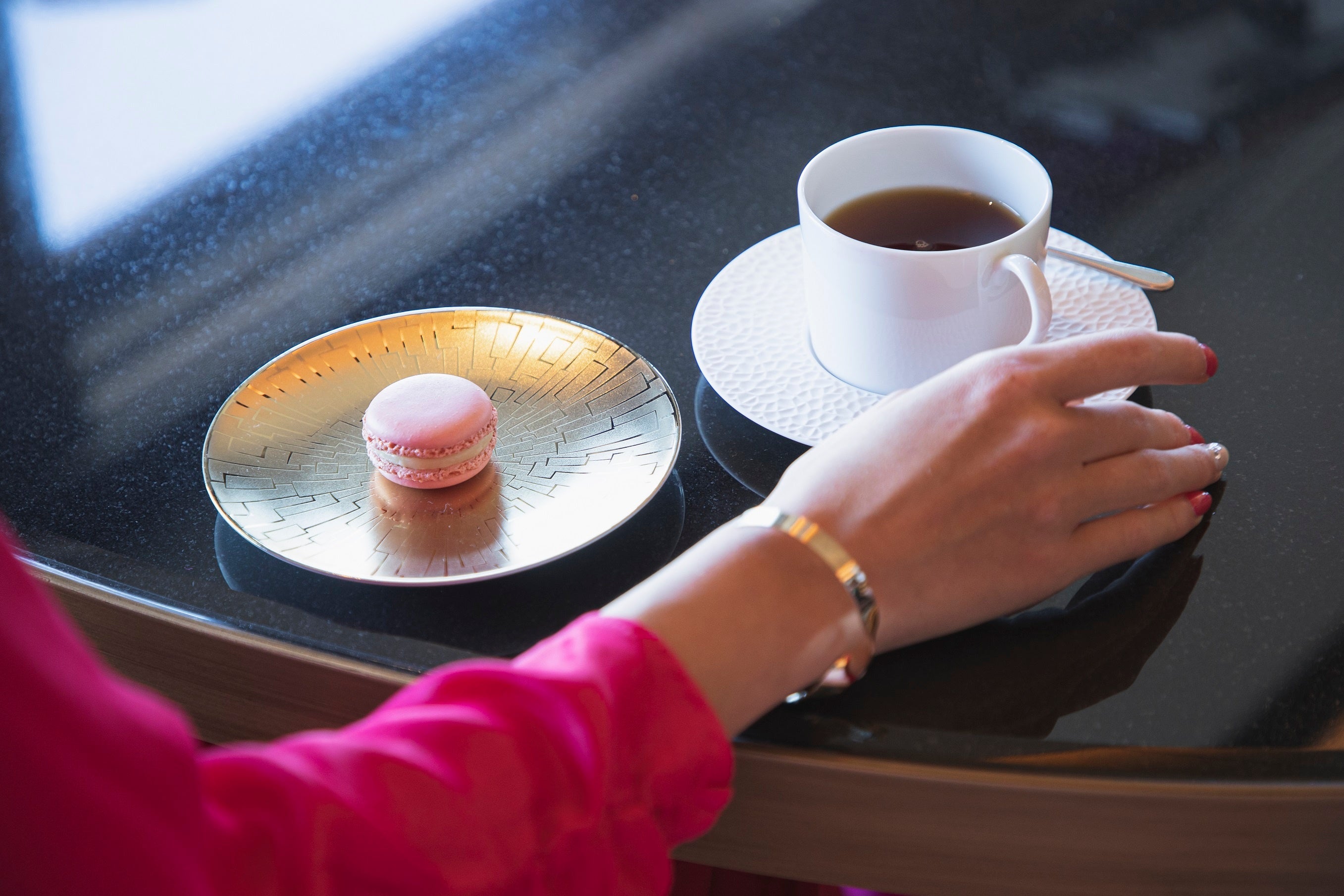 ロビーを抜け階段を上ると目の前に広がる2階ティーサロン「サロン ド テ フォション」。さりげなくピンクを配するなど、パリと京都がエレガントに融合する、日常とは一線を画すくつろぎの空間が広がります。フォションホテルパリで人気の「アフタヌーンティー」は京都バージョンで登場。その他パリで人気のシグネチャースイーツやマカロン、京都限定フレーバーティーなど、さまざまにご用意しております。
