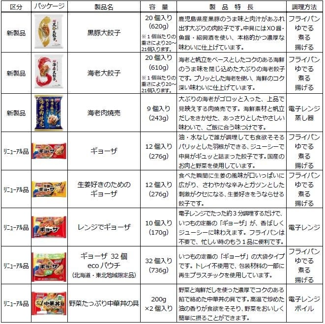 このたび、ギョーザ売上日本一(※3)の「ギョーザ」、ガツンとした生姜がクセになる「生姜好きのためのギョーザ」、トレイ不使用で大袋タイプの「ギョーザ 32個ecoパウチ」(地域限定品)は、焼き上がりの羽根がさらに大きく広がり、パリパリとした食感が向上するようにリニューアルします。また、北海道地域限定で販売していた「ギョーザ 32個ecoパウチ」は、販売地域を東北6県にも拡大します。