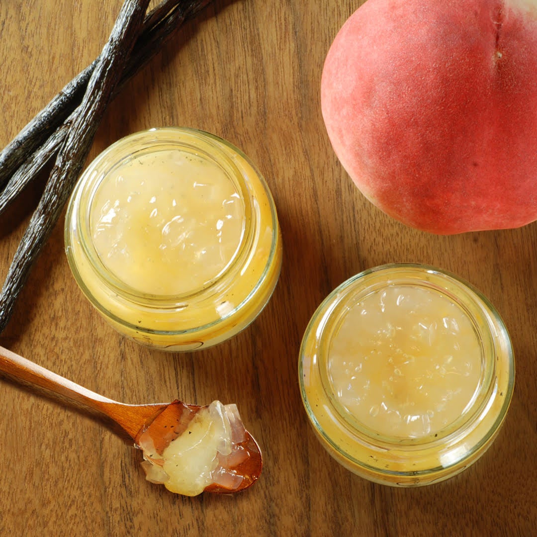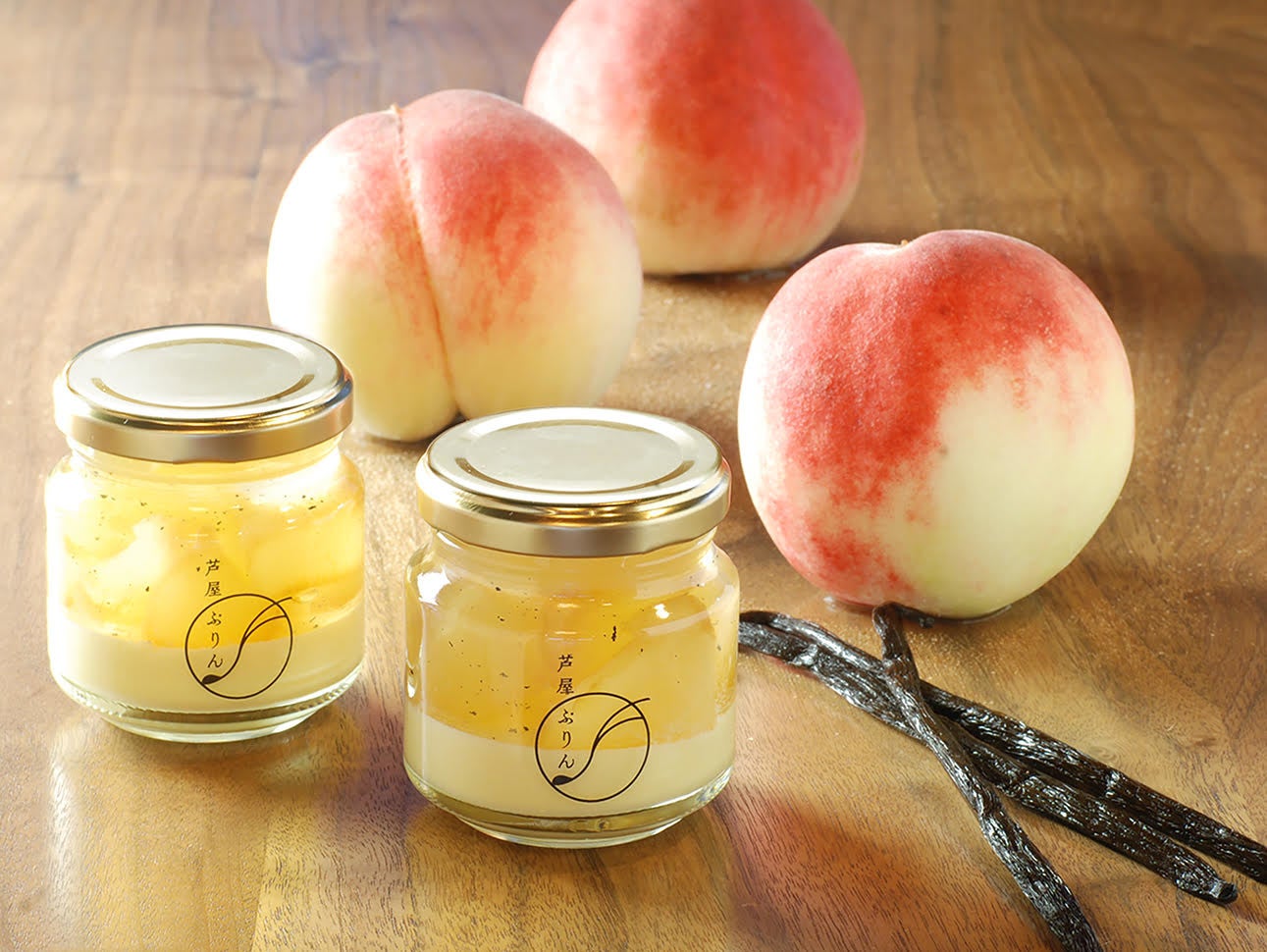 「香り広がる完熟桃と天然のバニラビーンズがアクセントのゼリー+濃厚なミルキープリン」