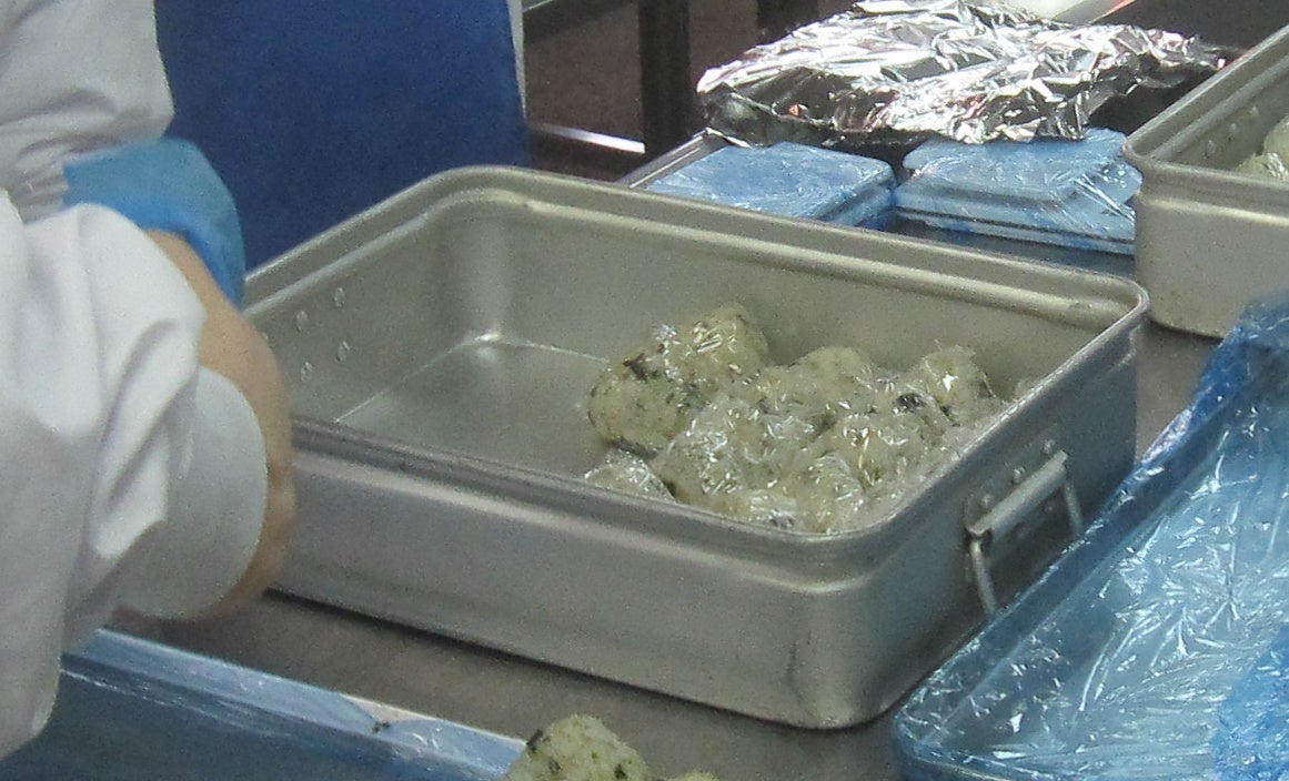 おにぎりは、配膳のしやすさ、食べやすさを考慮してラップに包みます。