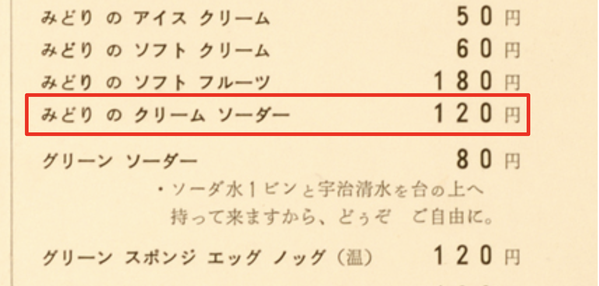 1963年当時、大学卒の初任給は15.000円ほど。映画が200円、ラーメン1杯50円、コーヒー1杯60円という時代でした。120円のクリームソーダはデートの時や自分へのご褒美として注文するお洒落なメニュー。ちょっとした贅沢気分を味わえる飲み物だったようです。