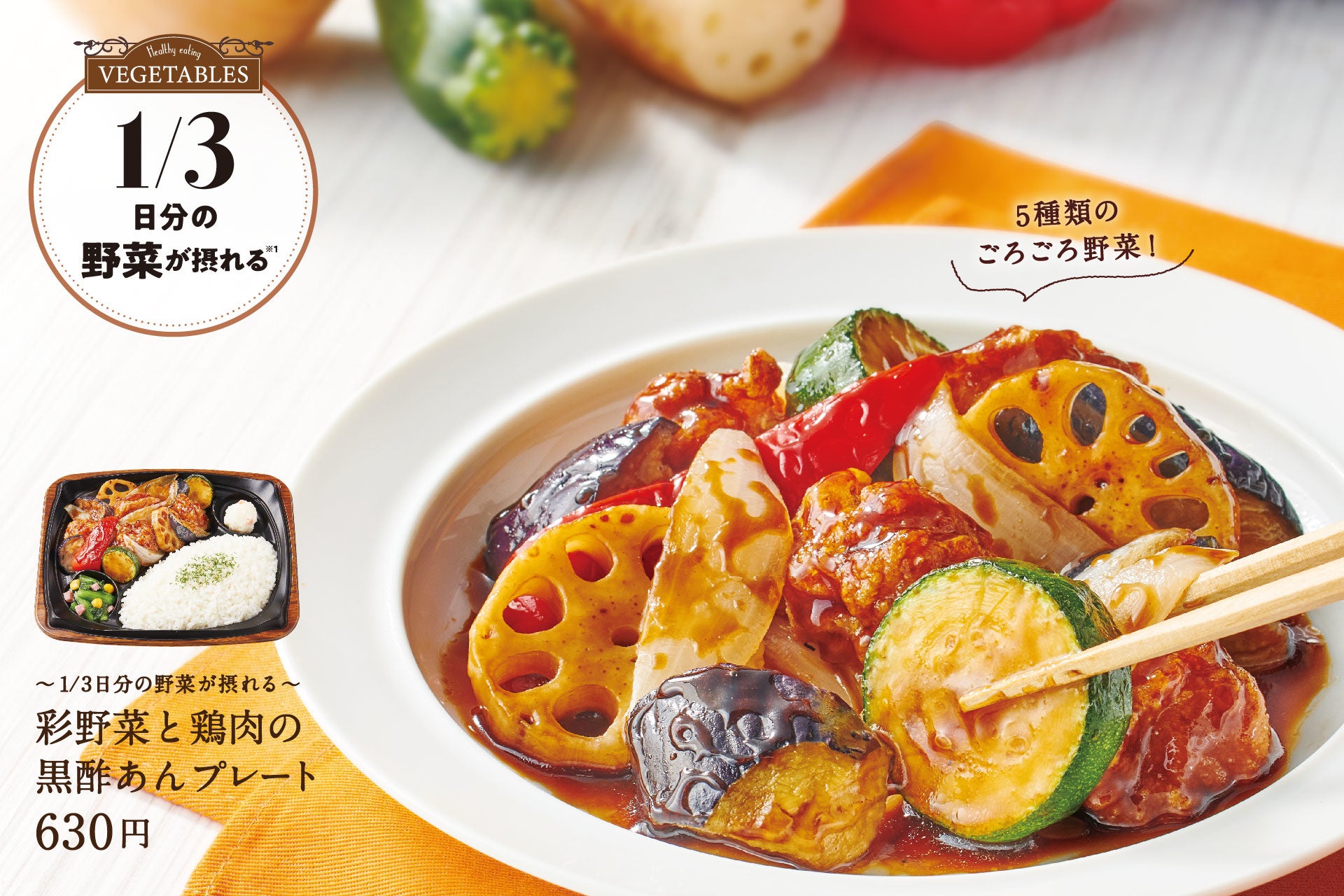 このたび「ほっともっとグリル」では、お客様の「野菜が摂れる商品がもっとほしい」という声にお応えし、1日に必要な野菜量の1/3が摂れる ※1 商品として、『彩野菜と鶏肉の黒酢あんプレート』630円を、7月12日(火)より新発売いたします。