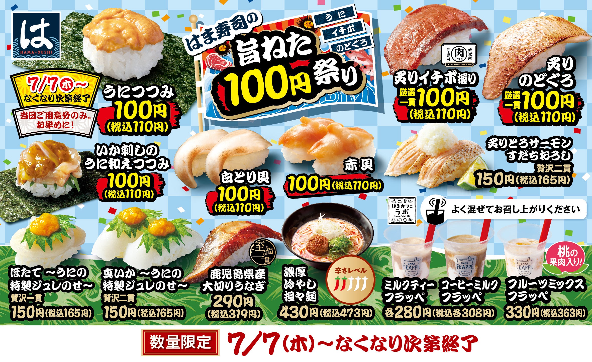 株式会社はま寿司(代表取締役社長:遠藤 哲郎 本社:東京都港区)が展開する100円寿司チェーン「はま寿司」は、7月7日(木)から、はま寿司厳選の旨ねたを特別価格の100円(税込110円)でご提供する「はま寿司の旨ねた100円祭り」を全国の店舗で開催します。ウニやイチボ、のどぐろの他に、暑い夏にぴったりな商品も販売します。