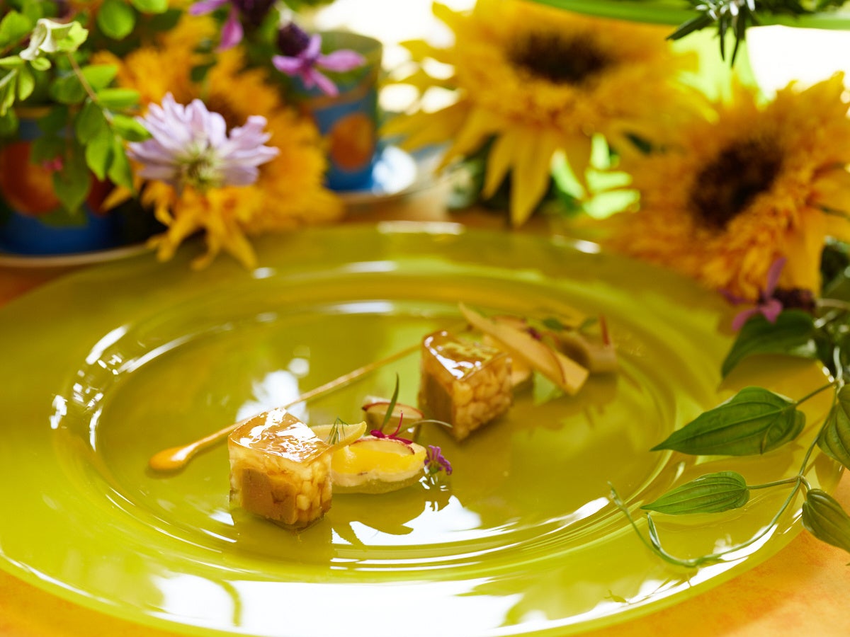 トゥールダルジャン東京のスペシャリテの幼鴨料理は備長炭でじっくりと焼き上げ、ほど良い酸味のある黒オリーブソースを合わせ、夏野菜とニース伝統のパニスをあしらった南仏らしい一皿。