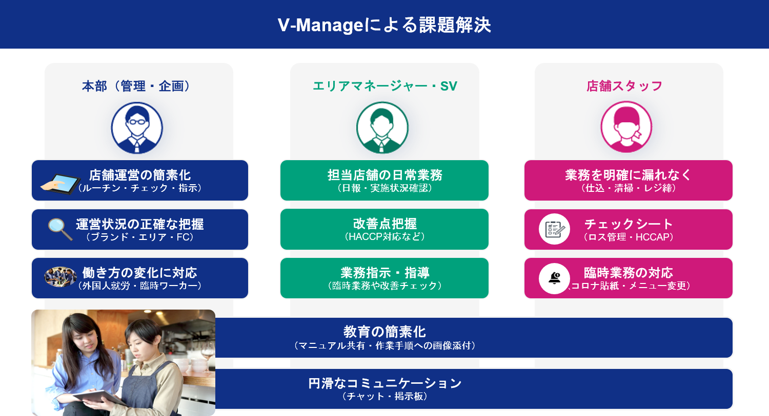このような中で、外食産業の生産性向上や人手不足、人件費の高騰等の課題解決を支援すべく、ITツールで業務効率化や店舗運営の省人化を支援し、店舗運営改善・DX浸透につなげることができるアプリ「V-Manage」を開発しました。