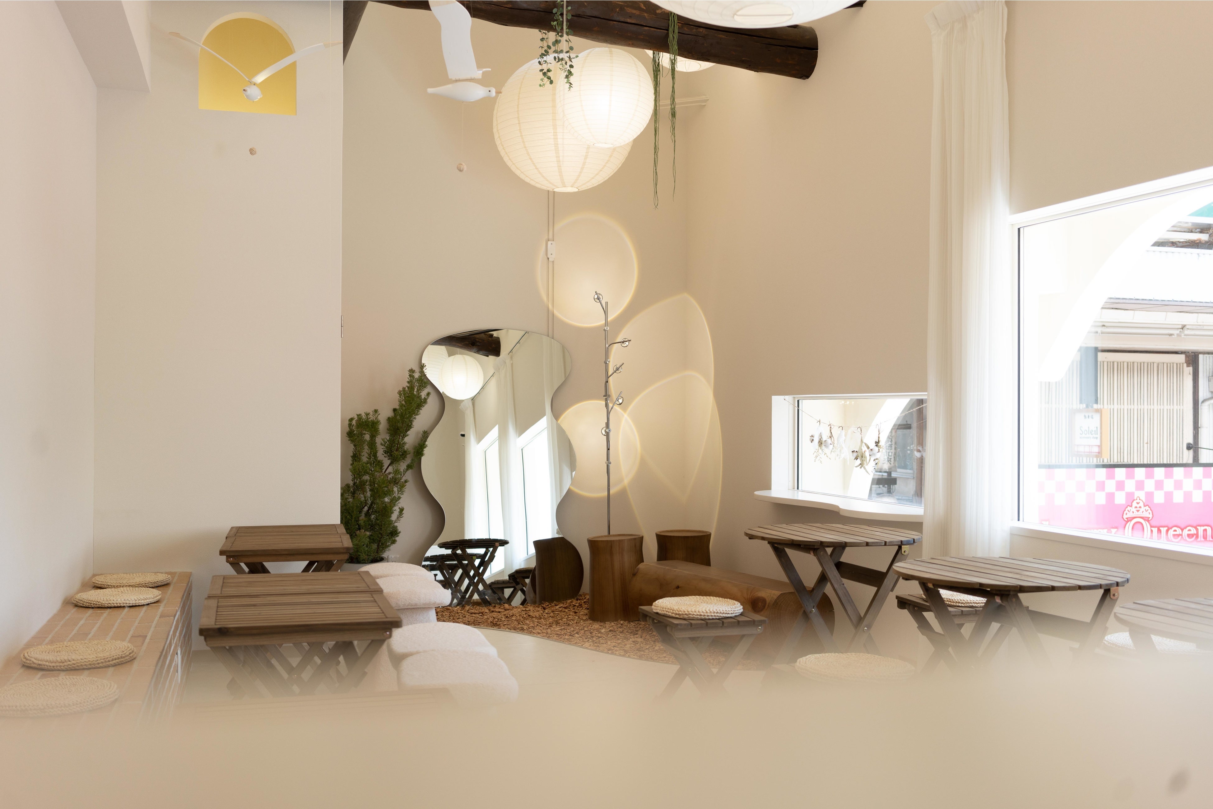 憩いと買い物の中心である商店街に「雲ノ茶 KUMONOCHA CAFE」があります。目印は可愛いブランコ。店内は雲をイメージした白を基調に太陽光と緑がアクセントになる癒しの空間。そんな特別な空間の中で、こころが和らぐメニューをご用意いたします。