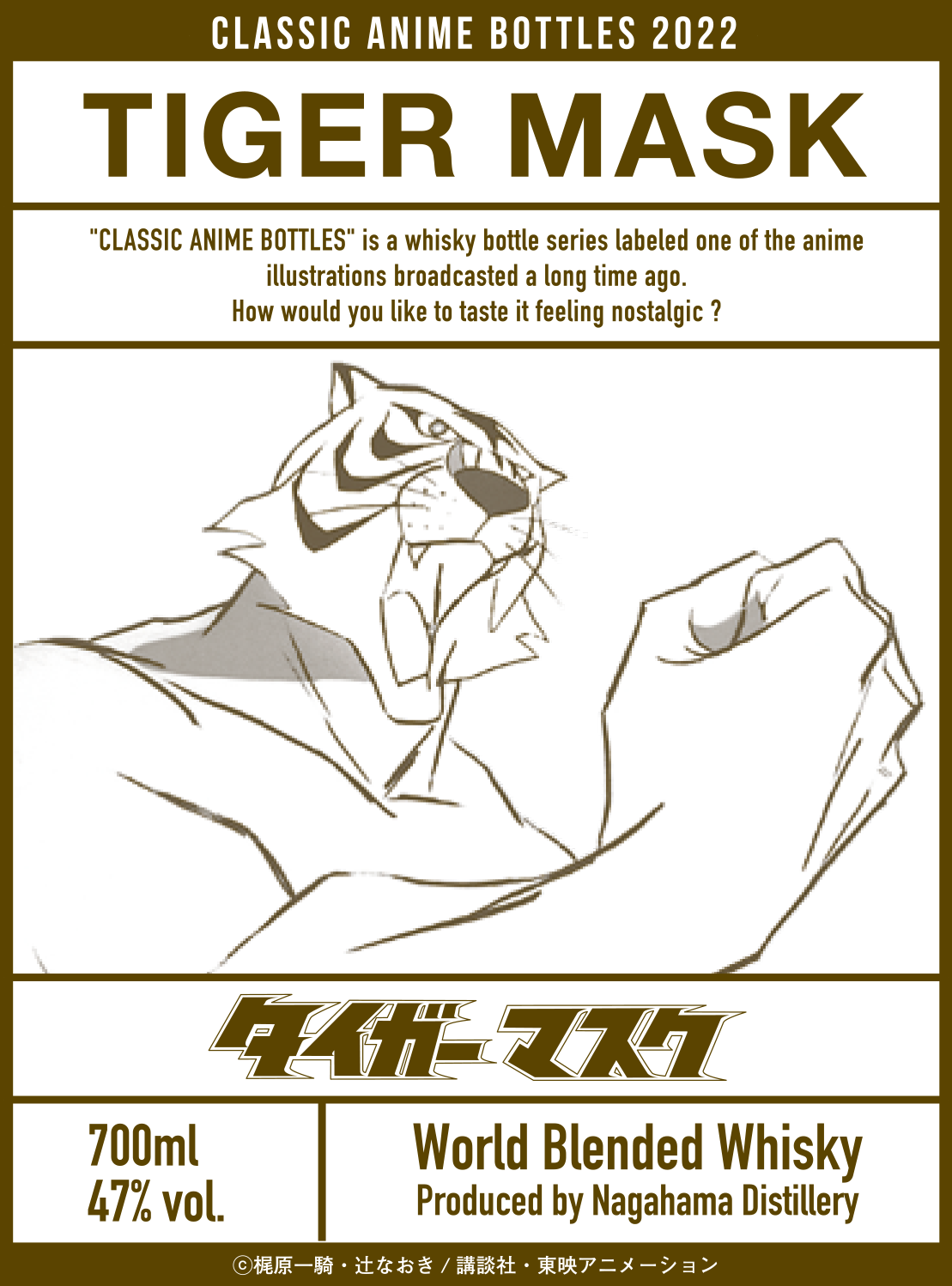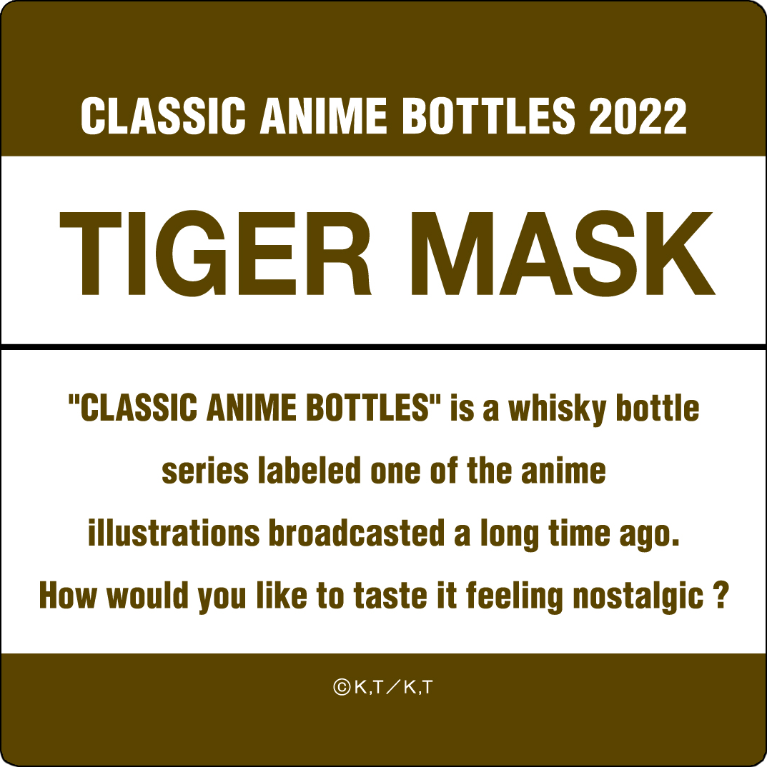 長濱蒸溜所と東映アニメーションの共同企画として、昔懐かしいアニメ作品ラベルをコンセプトとする「CLASSIC ANIME BOTTLES」を商品名に冠した、アニメ「タイガーマスク」ラベルのウイスキーが長浜浪漫ビール株式会社から発売されます。
