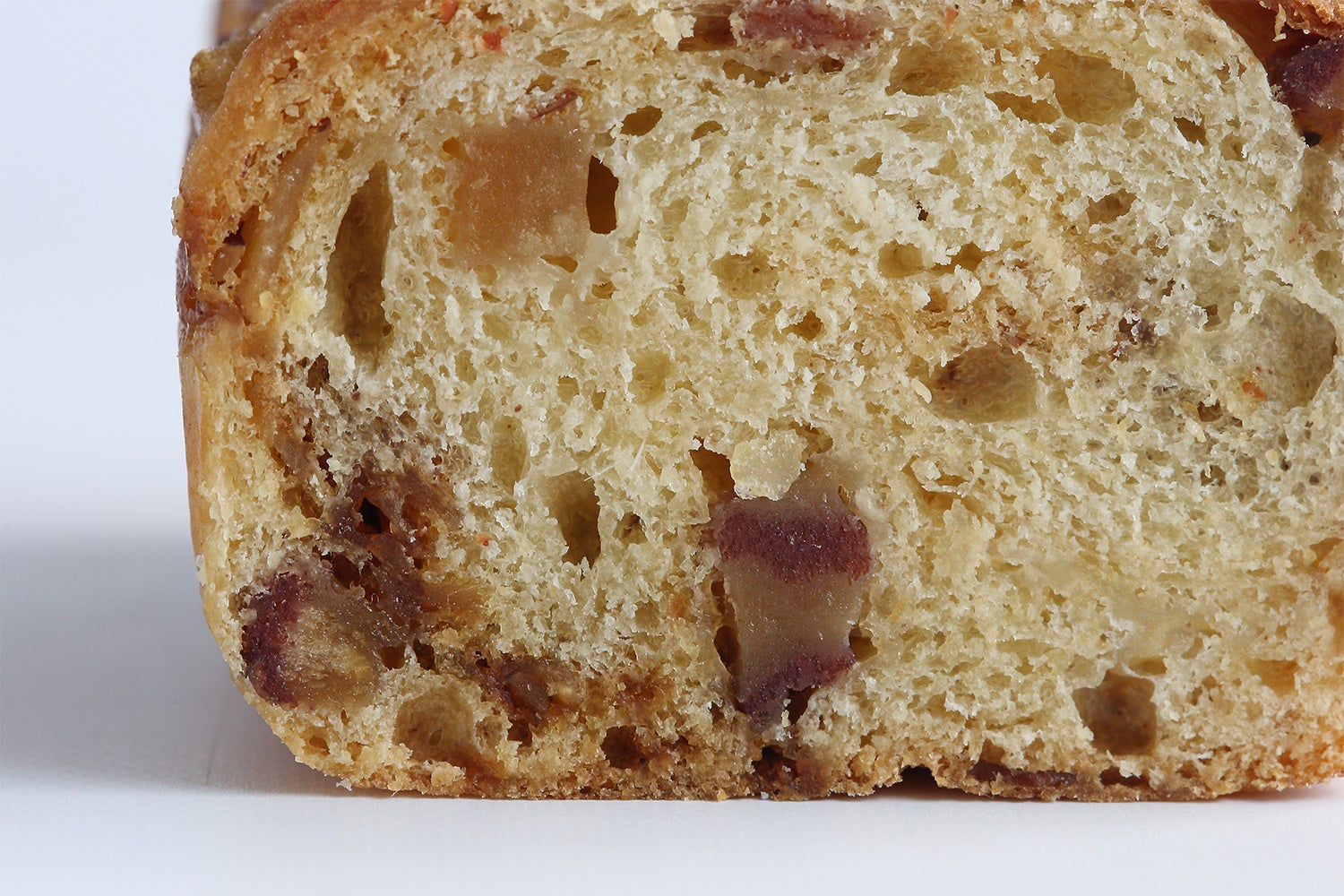 白ワインで漬けたシャインマスカットと赤ワインで漬けたプルーンを入れて。 香りの良いフルーティーなパネトーネです。